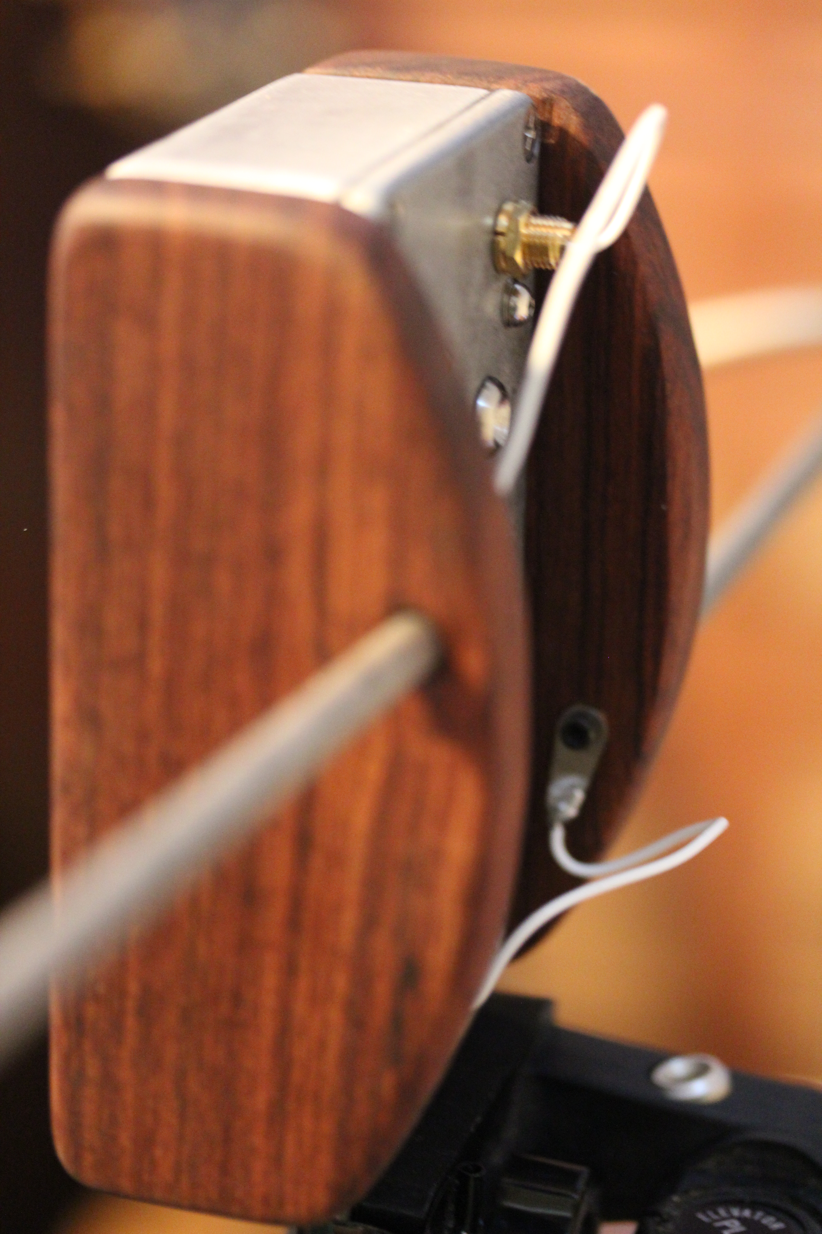 アンテナ基台を兼ねた木材によってケースがサンドイッチされるデザインを採用している。昔のオーディオコンポの雰囲気に近い。 Moogの最近出している製品も似たような感じだろうか。