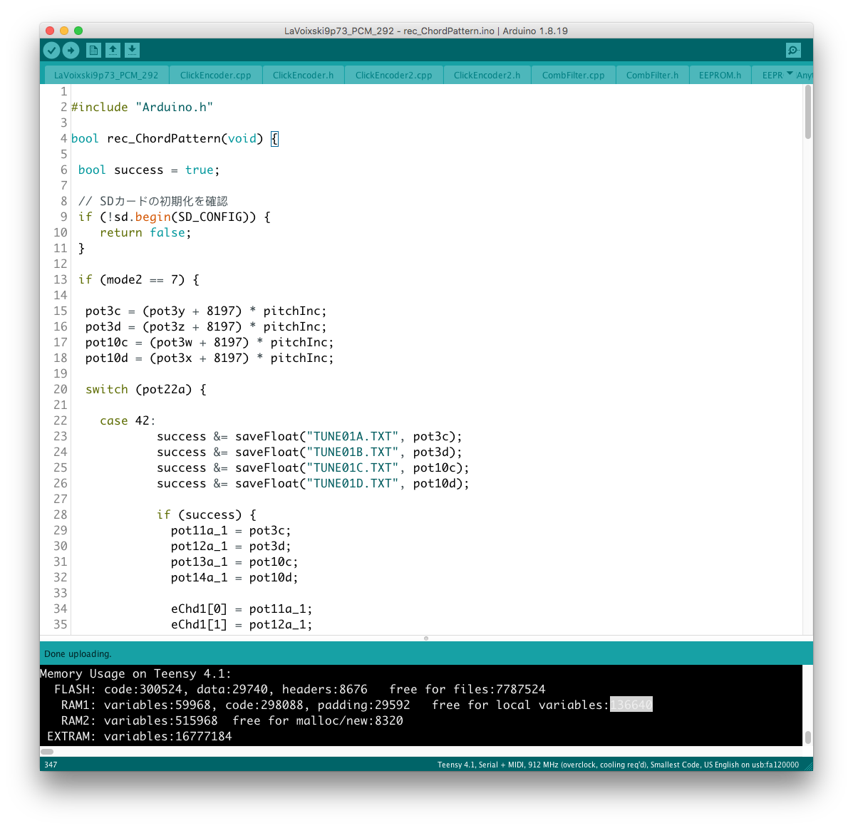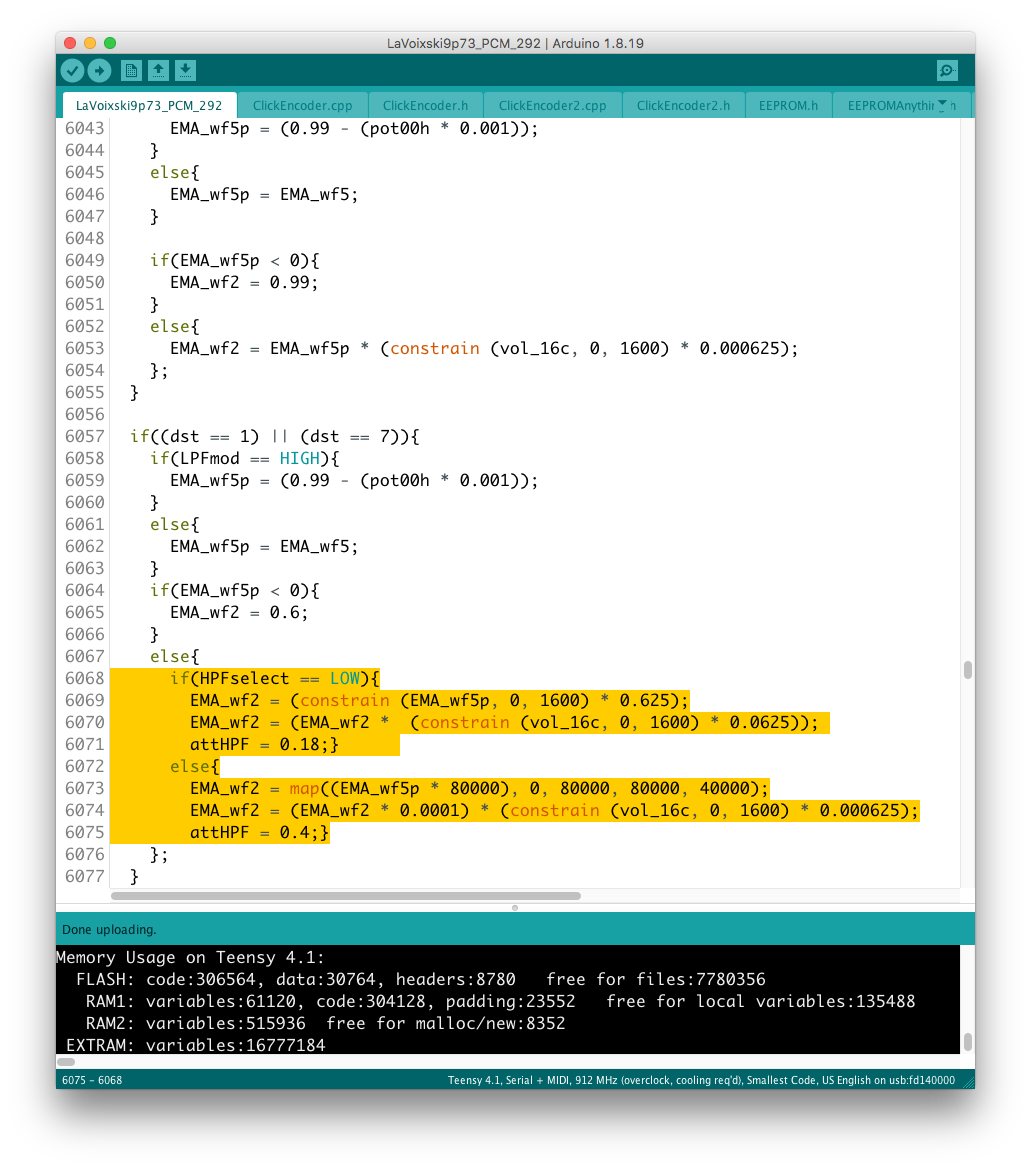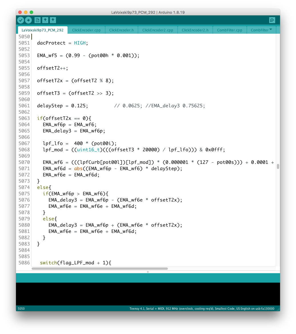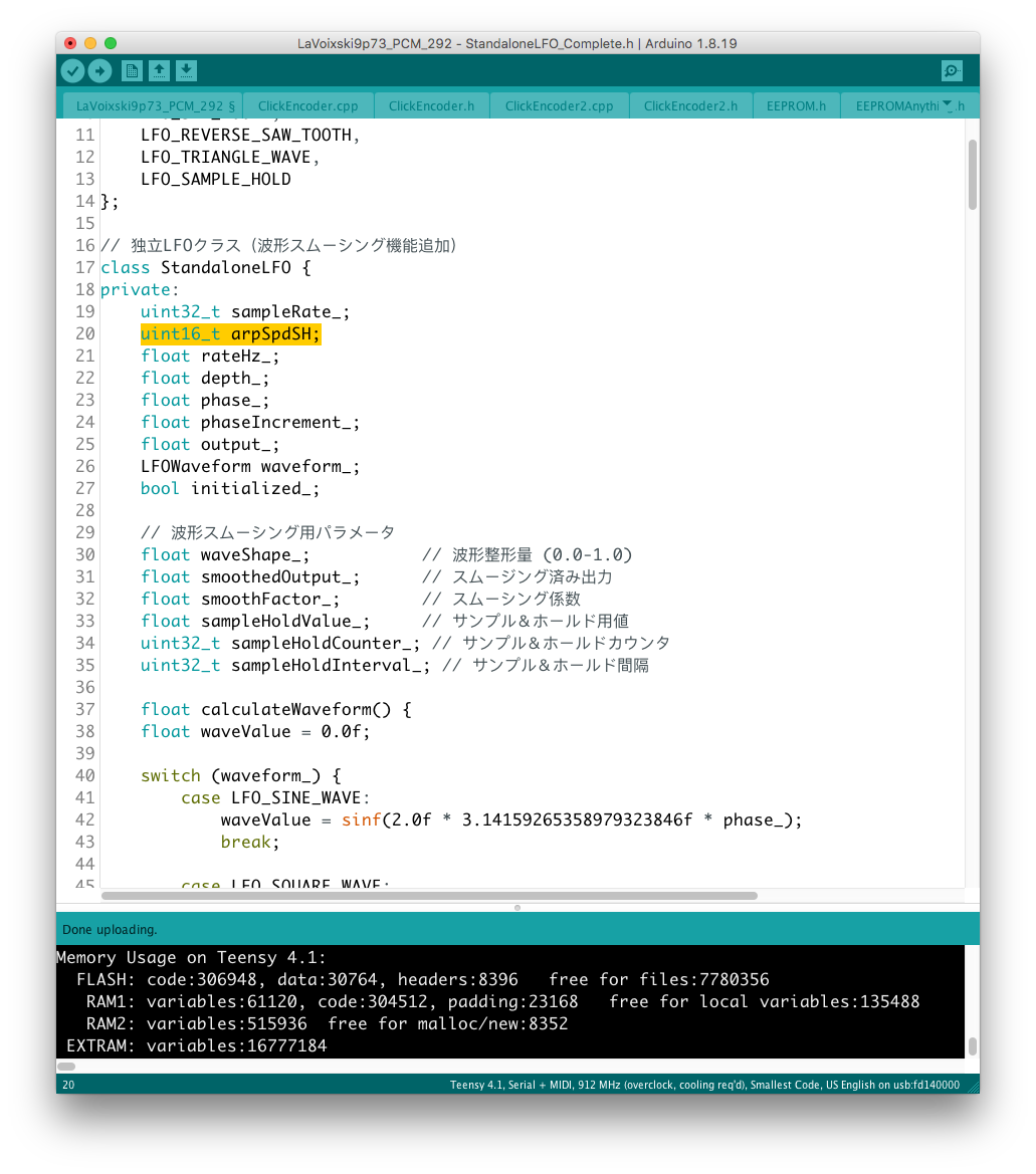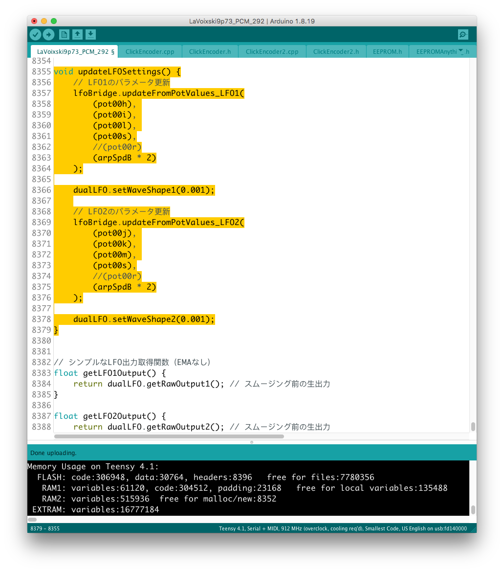 パラメータの増設それ自体は、既存のシステムを参考にすれば良いのだが、最大の問題はロータリーエンコーダで構成された巨大な制御系への組み込みだ。 頁の配分は CombFilter の直後、ArpSpd との間に行った。 導入を行う前に、Sequencer の Tempo 設定頁を ArpSpd と統合し、