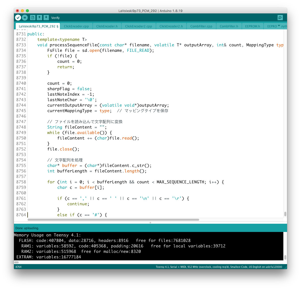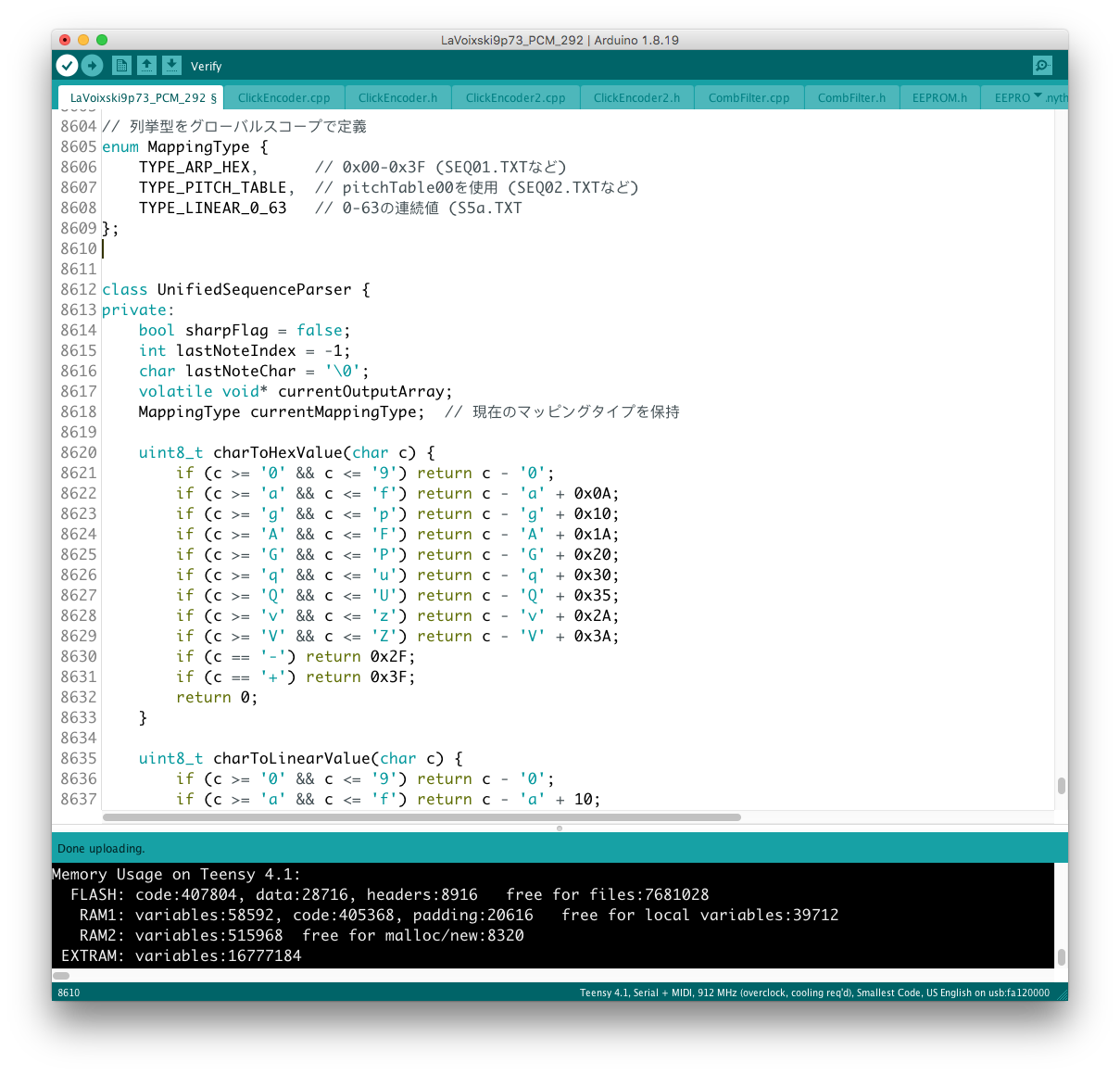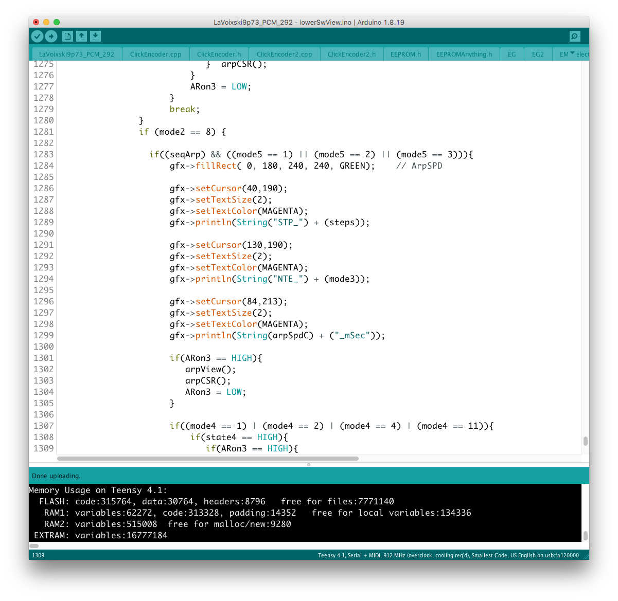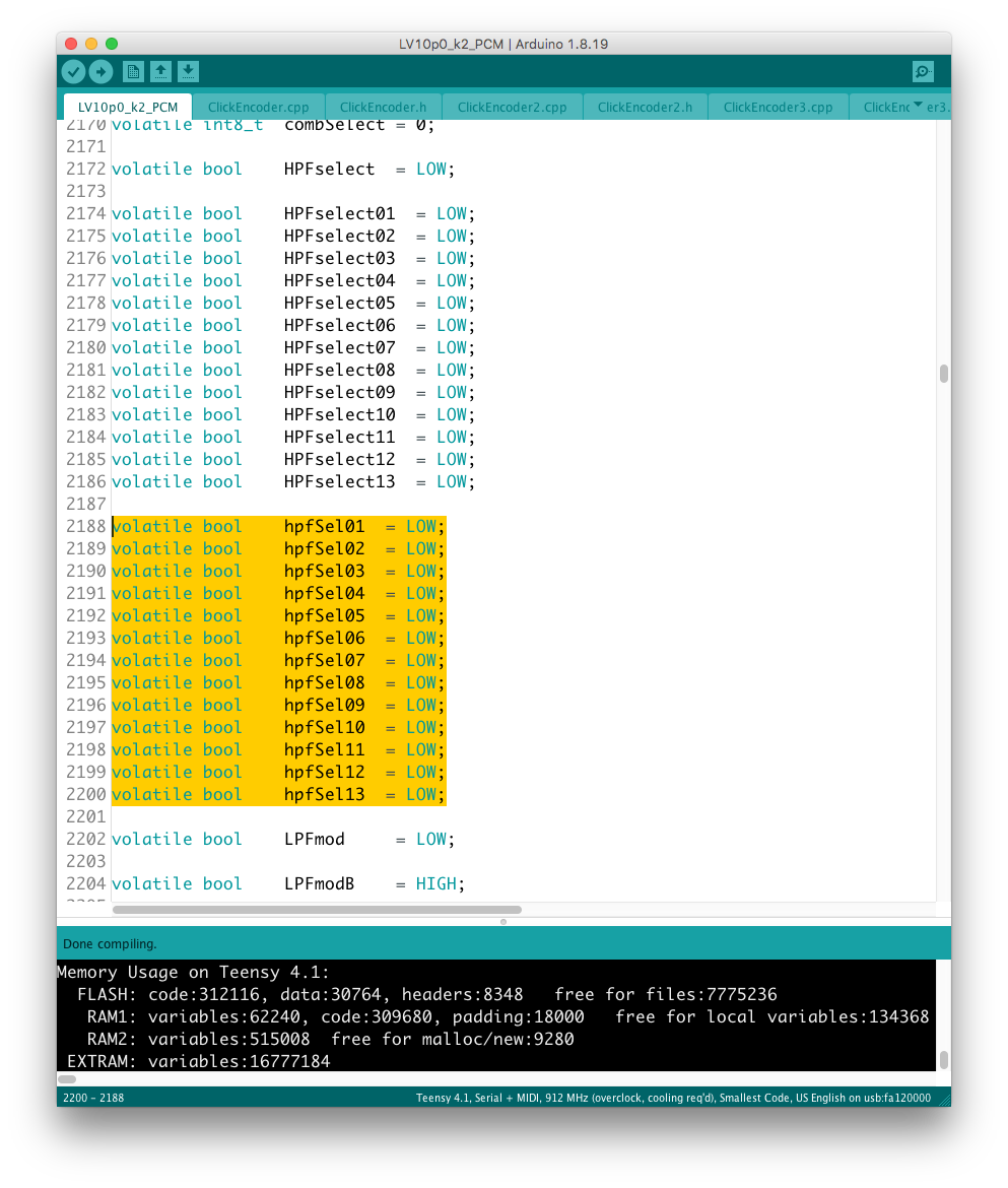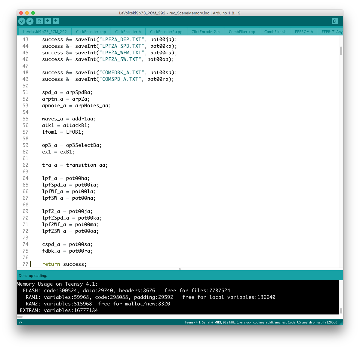 パラメータの増設それ自体は、既存のシステムを参考にすれば良いのだが、最大の問題はロータリーエンコーダで構成された巨大な制御系への組み込みだ。 頁の配分は CombFilter の直後、ArpSpd との間に行った。 導入を行う前に、Sequencer の Tempo 設定頁を ArpSpd と統合し、