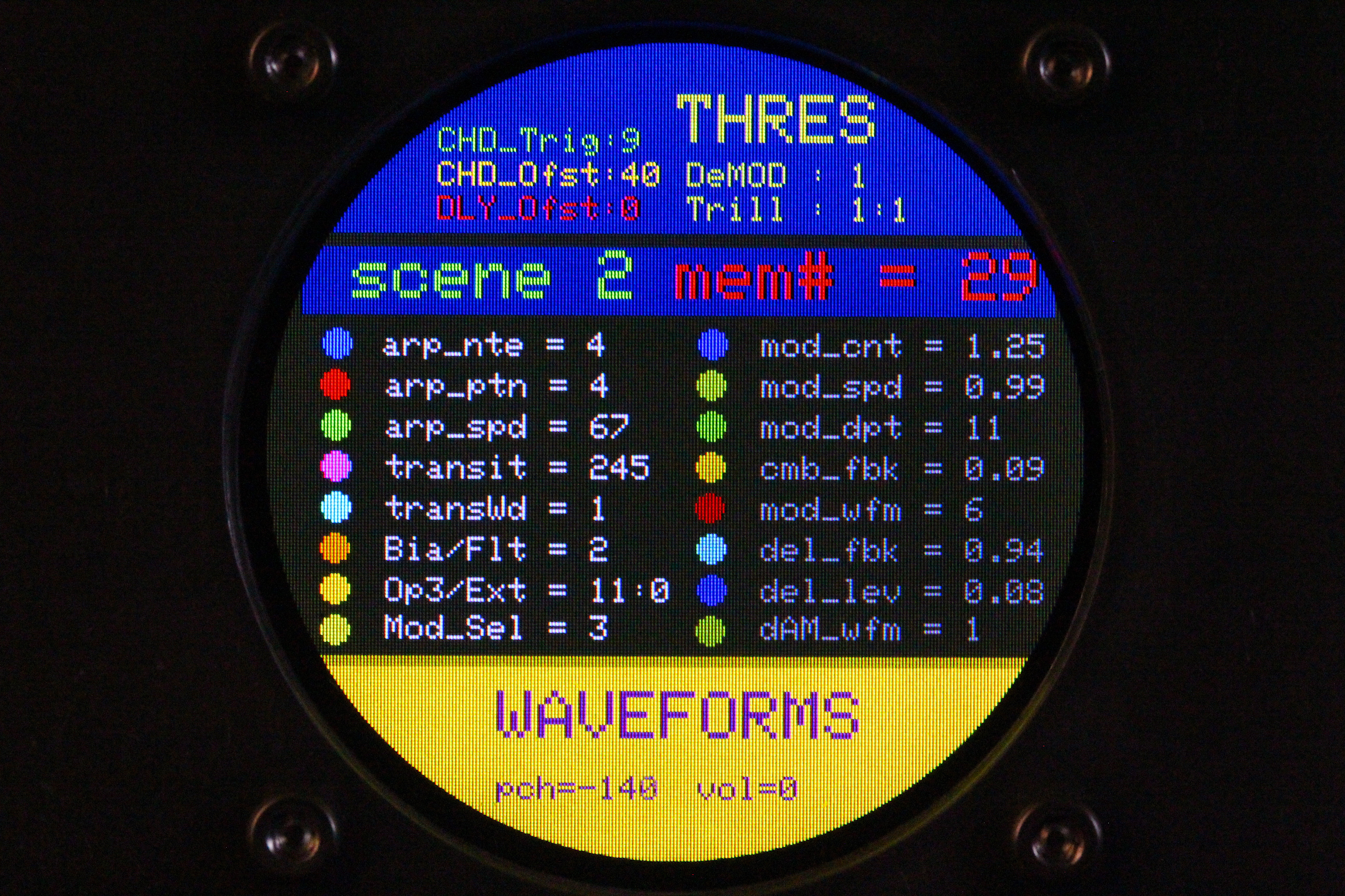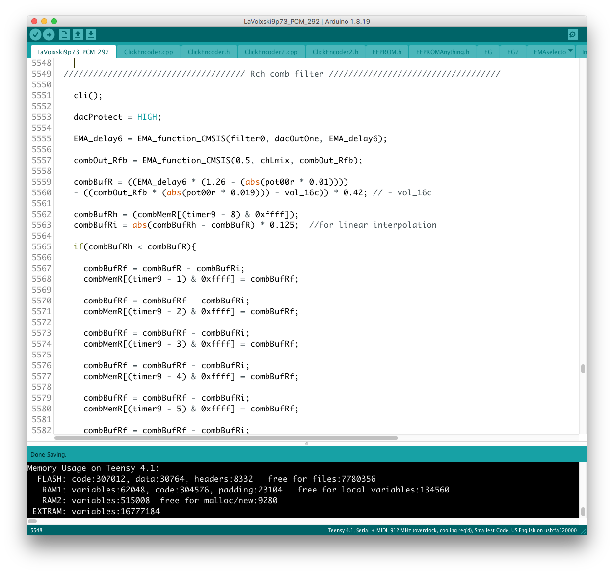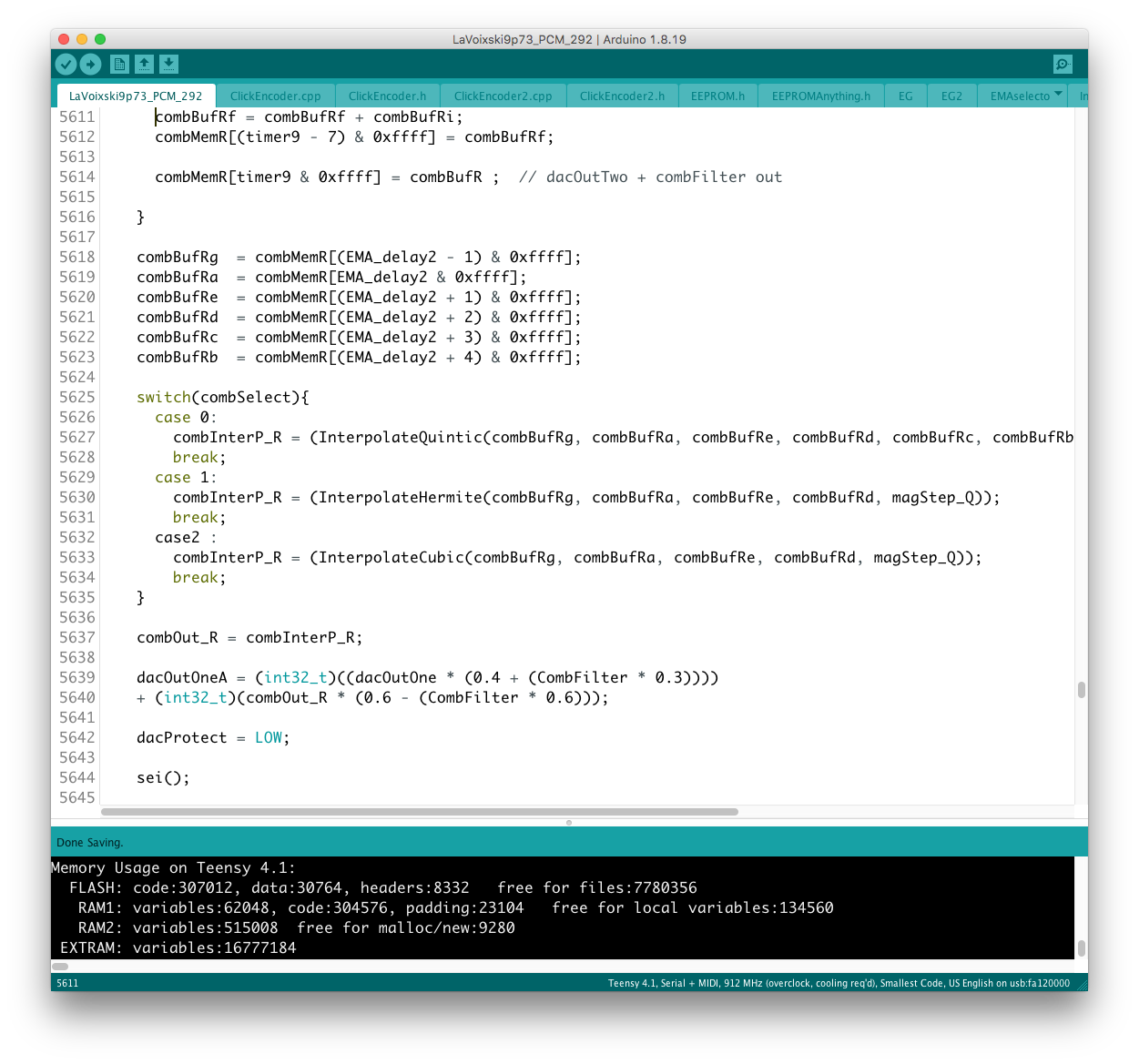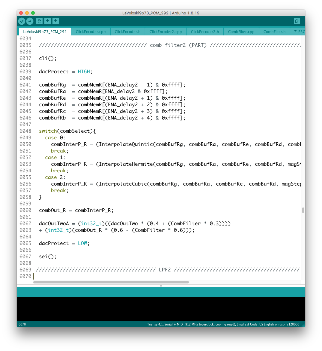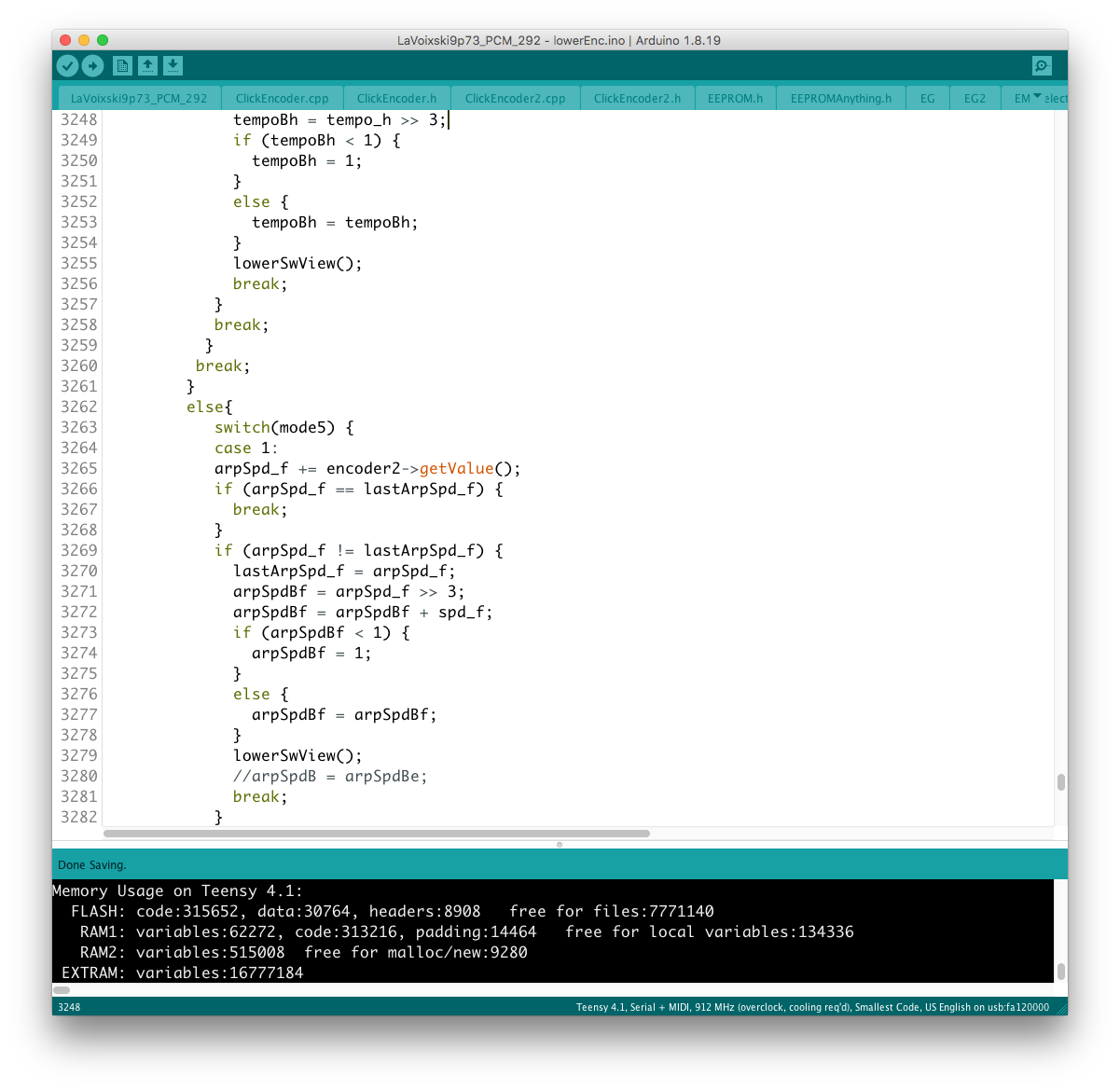 パラメータの増設それ自体は、既存のシステムを参考にすれば良いのだが、最大の問題はロータリーエンコーダで構成された巨大な制御系への組み込みだ。 頁の配分は CombFilter の直後、ArpSpd との間に行った。 導入を行う前に、Sequencer の Tempo 設定頁を ArpSpd と統合し、