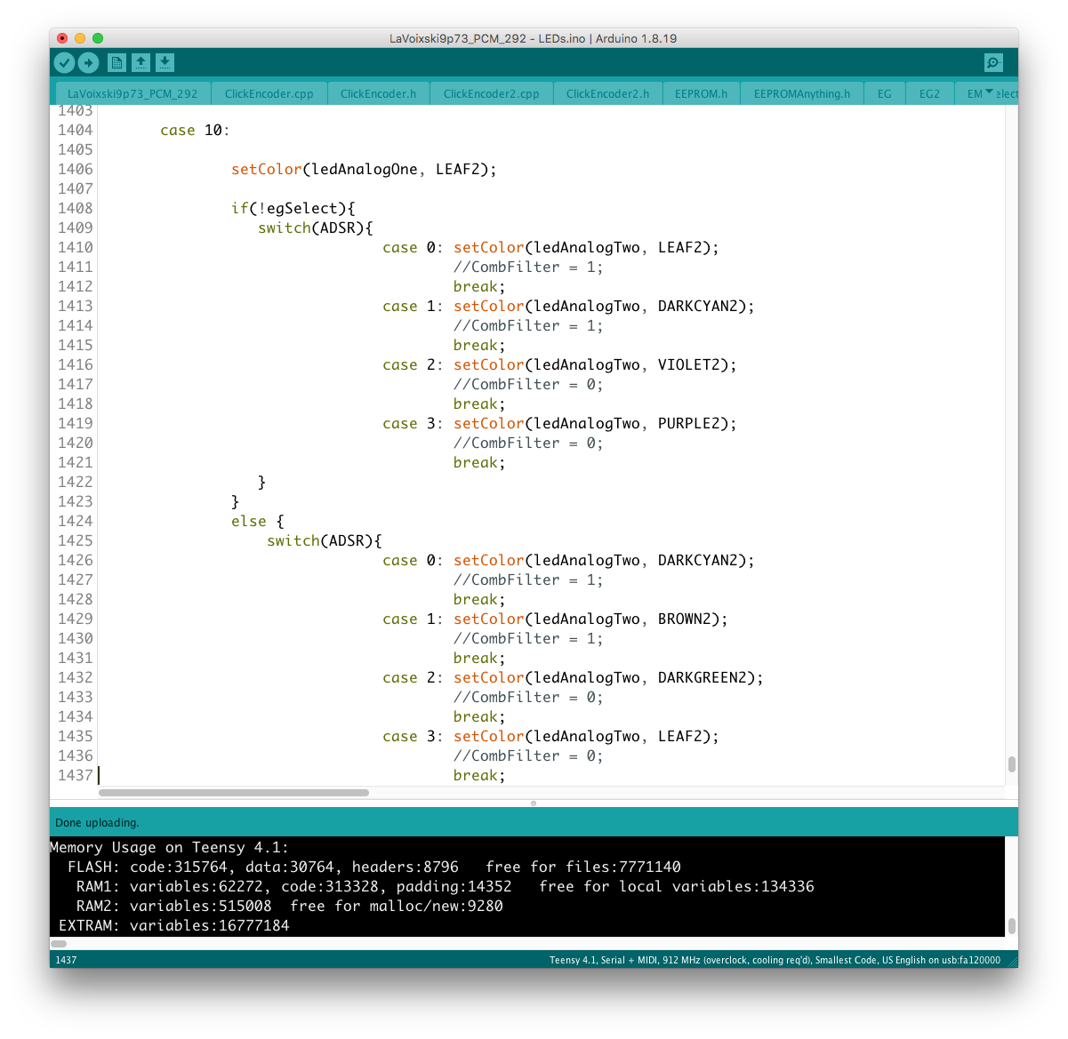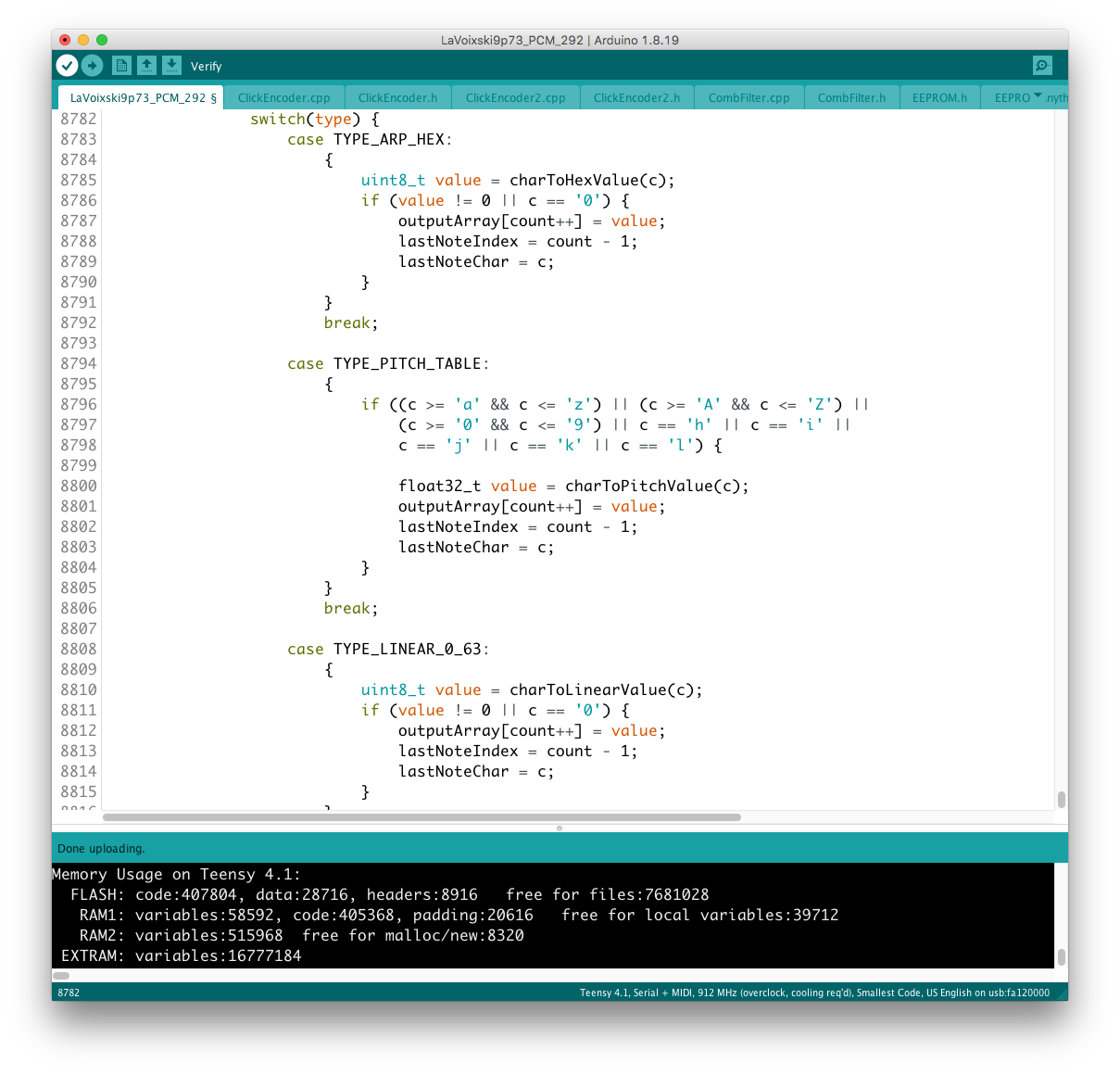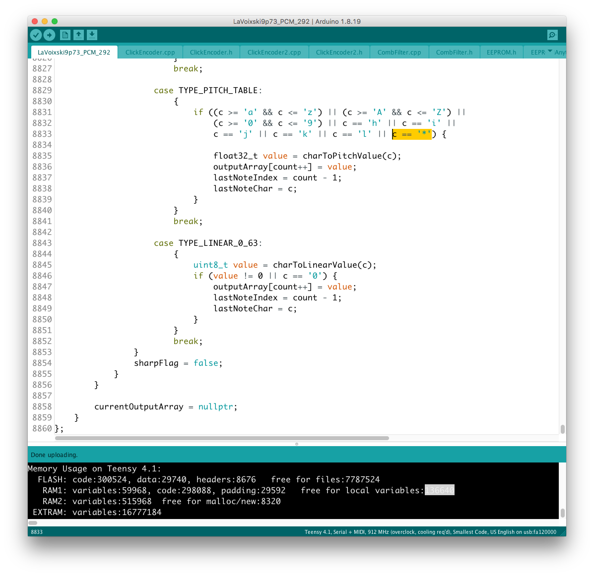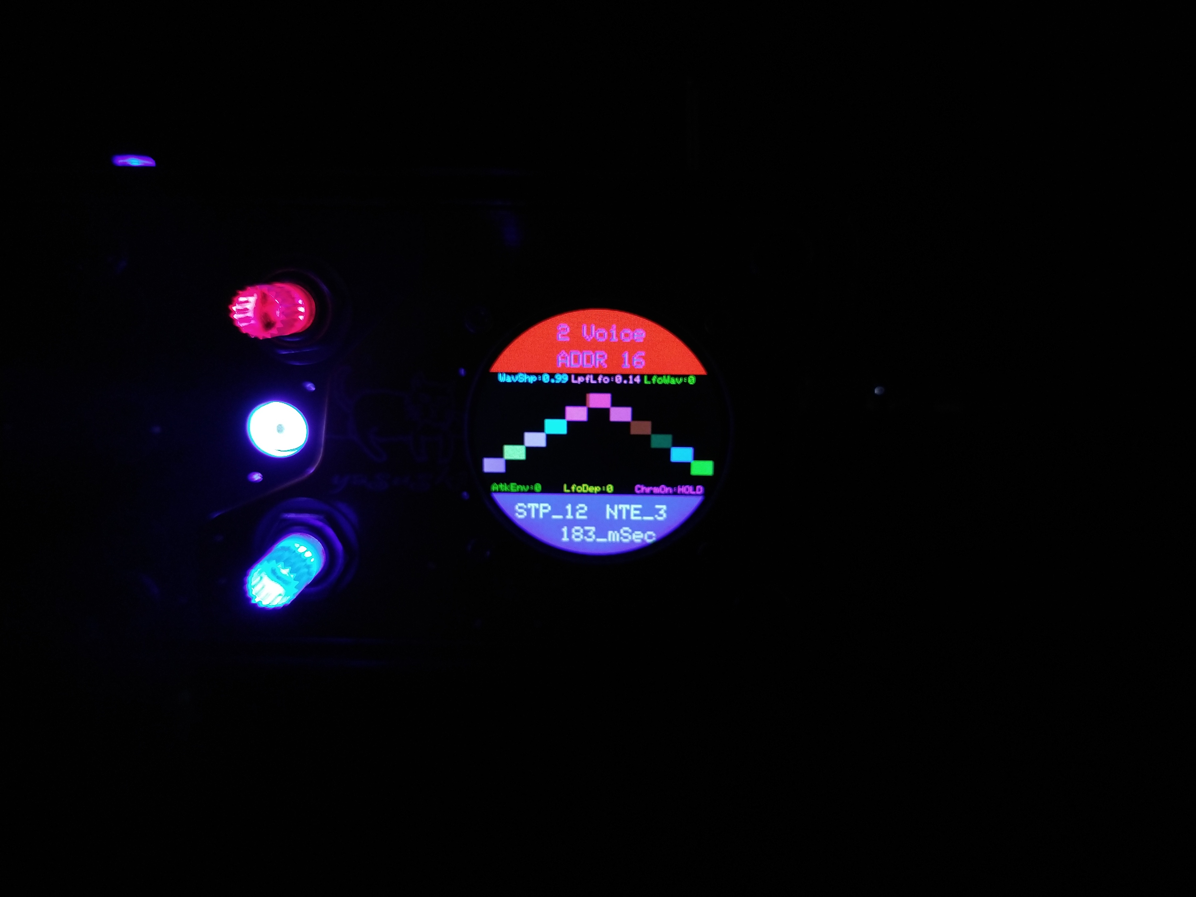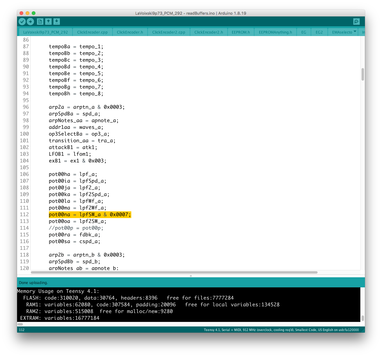 パラメータの増設それ自体は、既存のシステムを参考にすれば良いのだが、最大の問題はロータリーエンコーダで構成された巨大な制御系への組み込みだ。 頁の配分は CombFilter の直後、ArpSpd との間に行った。 導入を行う前に、Sequencer の Tempo 設定頁を ArpSpd と統合し、
