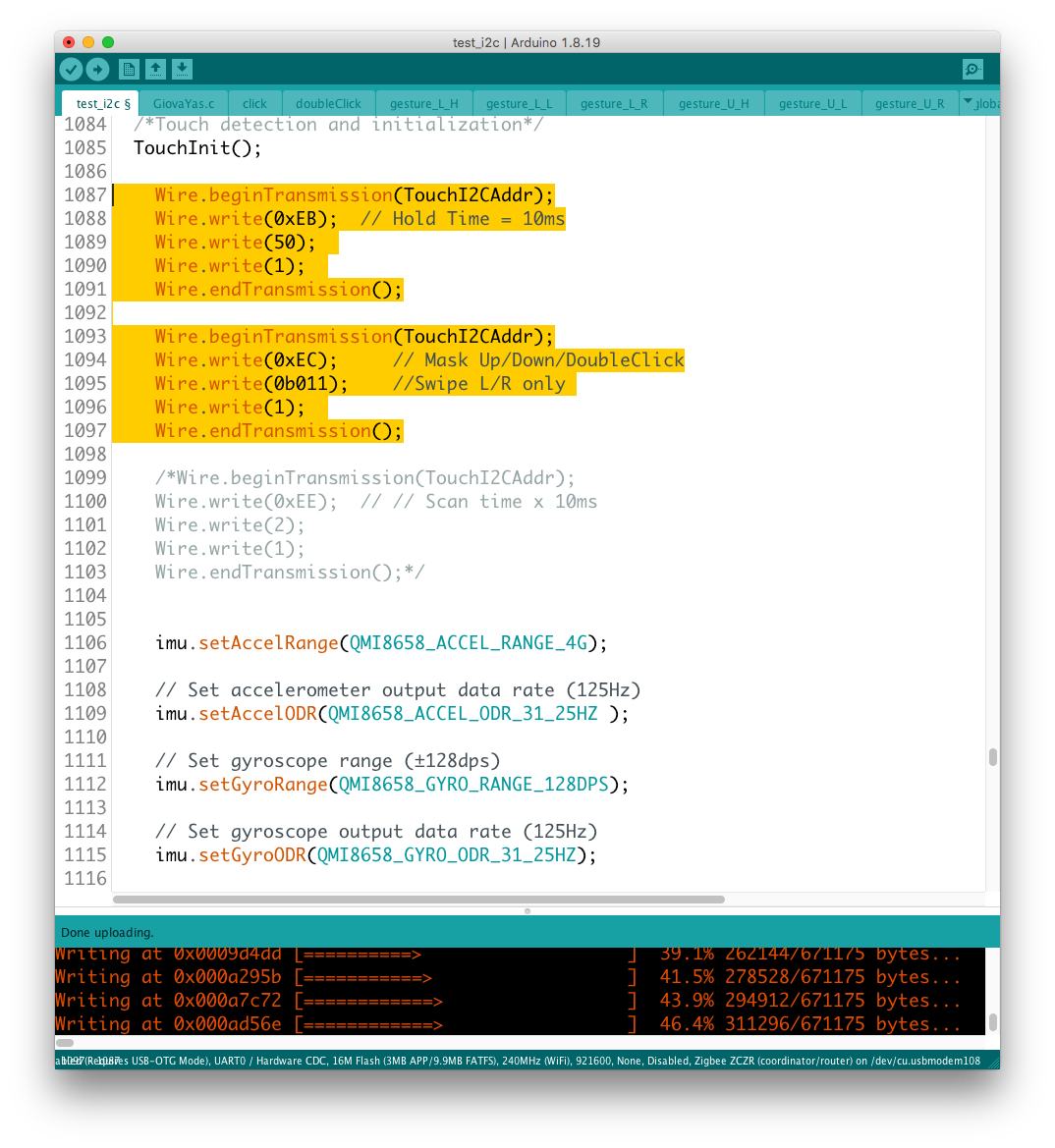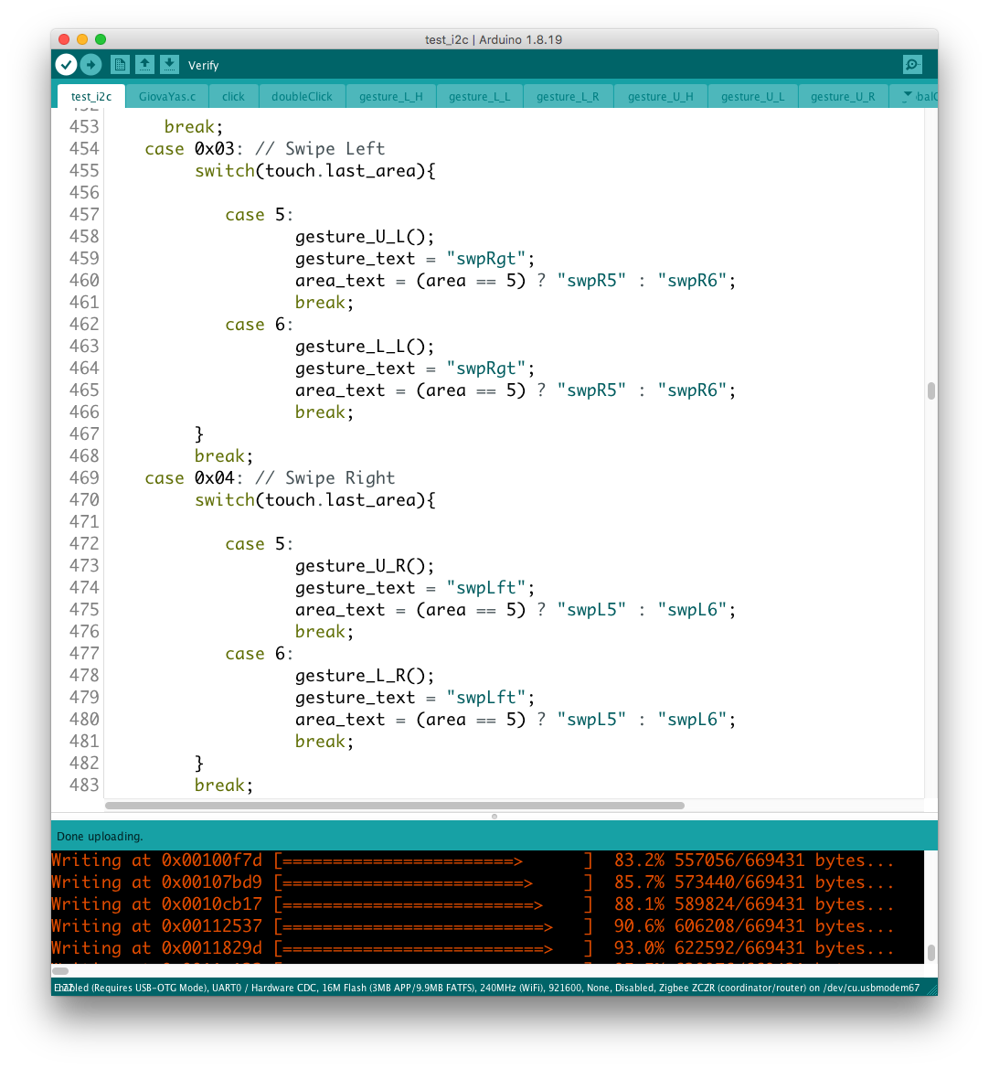 ここで採用したGesutureは左右のスワイプで、それらを上下のエリアに分離して、シングル・ダブルクリックに分配していたパラメータを配置した。 実験を行った結果、予想通りコンフリクトの発生を認めつつも動作の継承を確認できたので、元からあったMCU側のGesture判定ルーティンからのリンクを廃し、判定をセンサ側に引き渡すことに成功した。