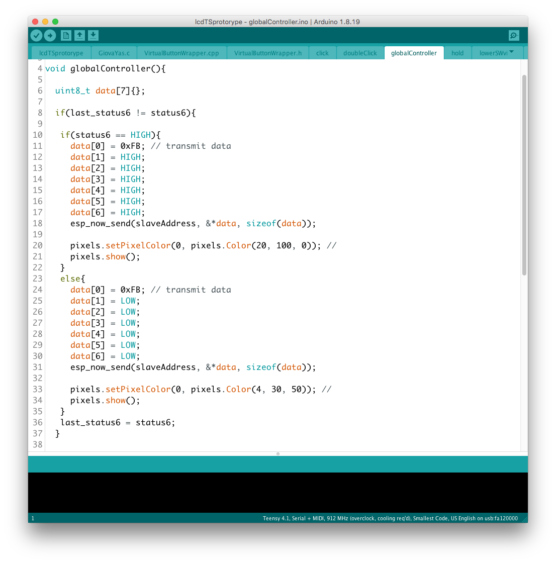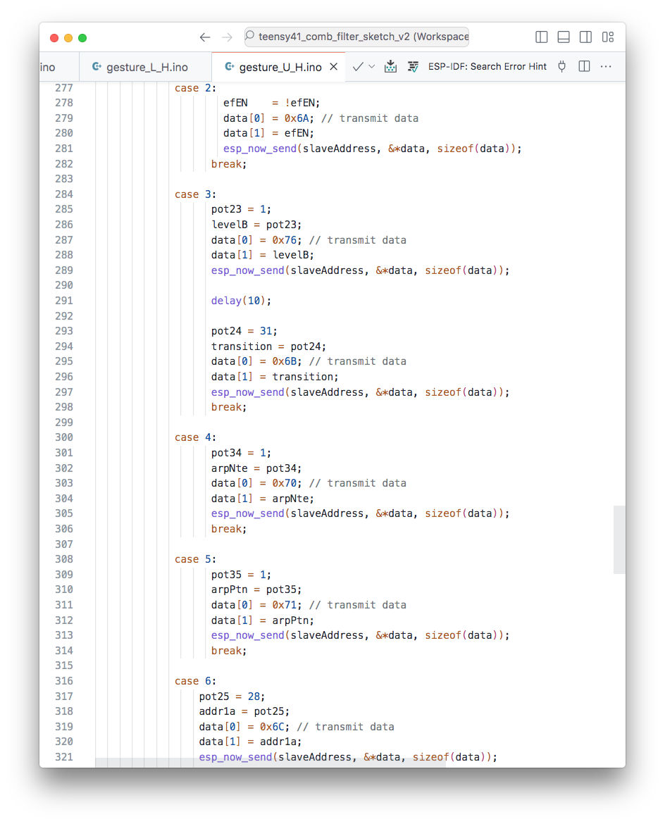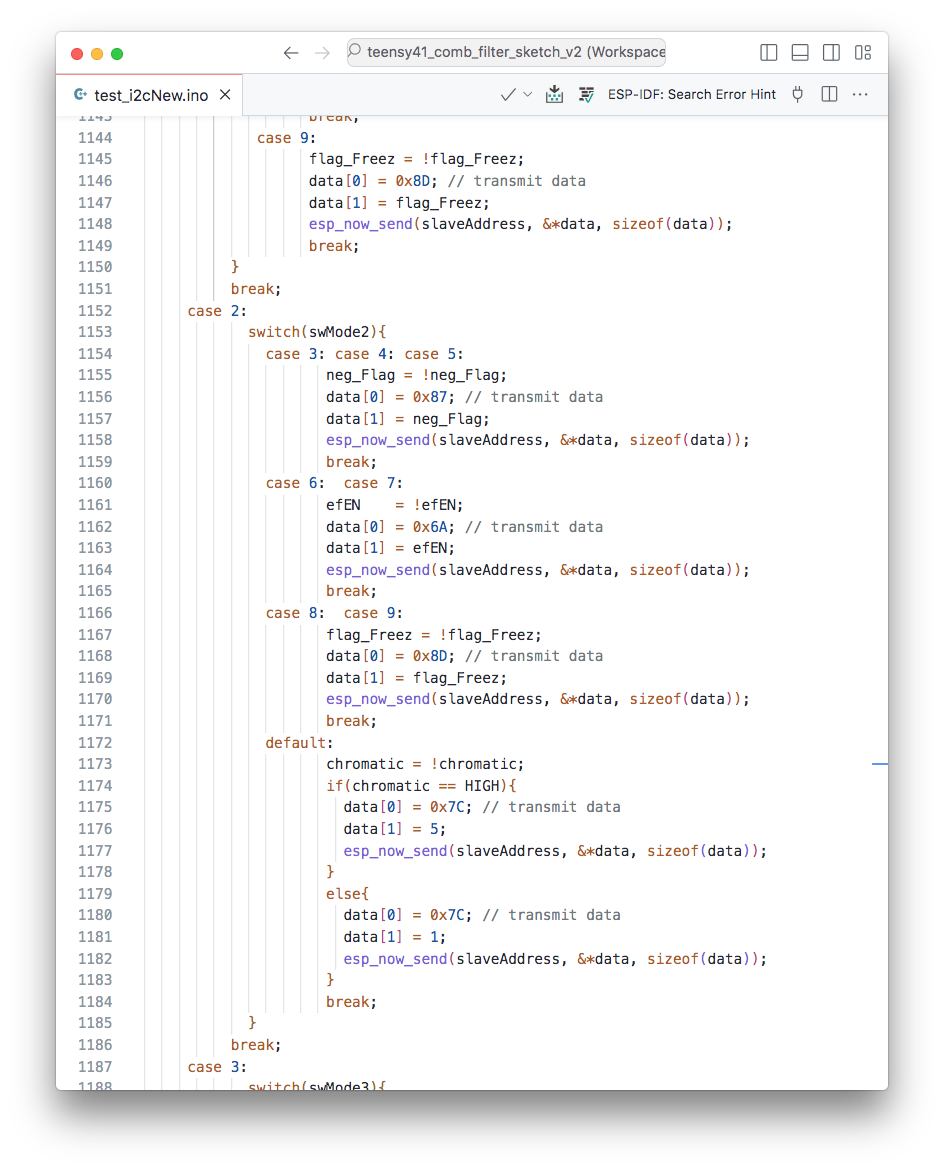 一方、ノイズといえば楽器側にも問題があり、ESP_NOW の受信を確認する目的で駆動していた NeoPixel(LEDの制御ライブラリ)が発するノイズの影響はかなり深刻なレベルとなっていて、これを機会にデータのハンドリングそれ自体に関与していない「パイロットランプ」を無線受信系から排除することにした。
