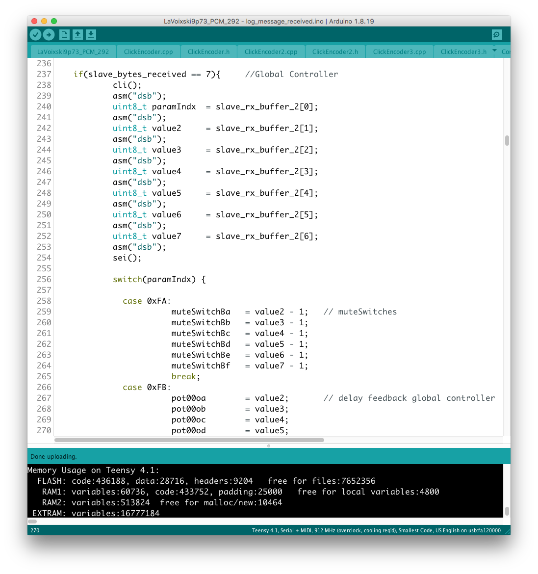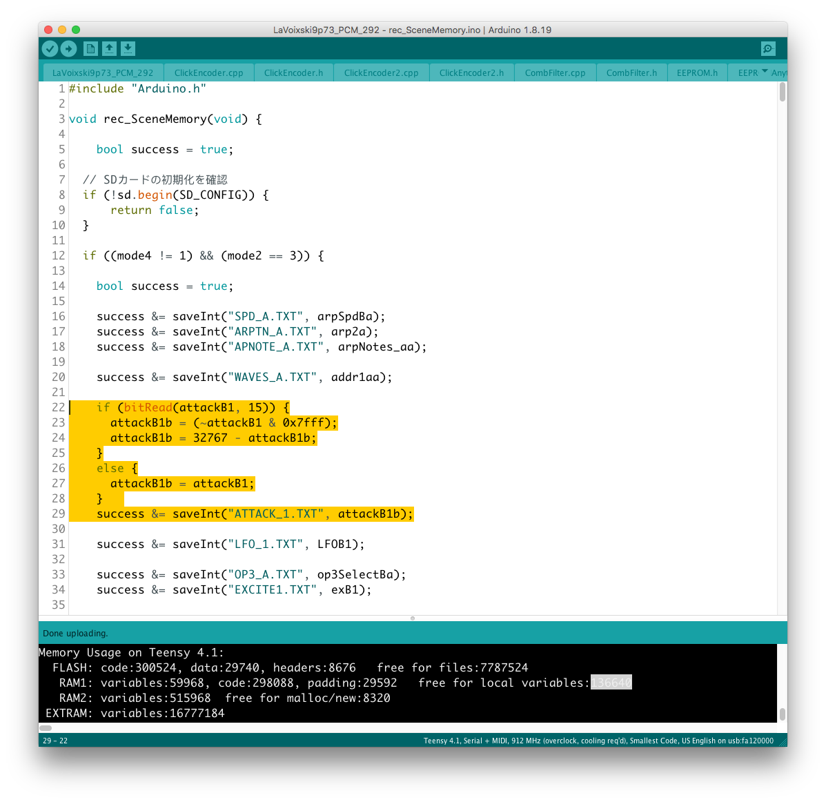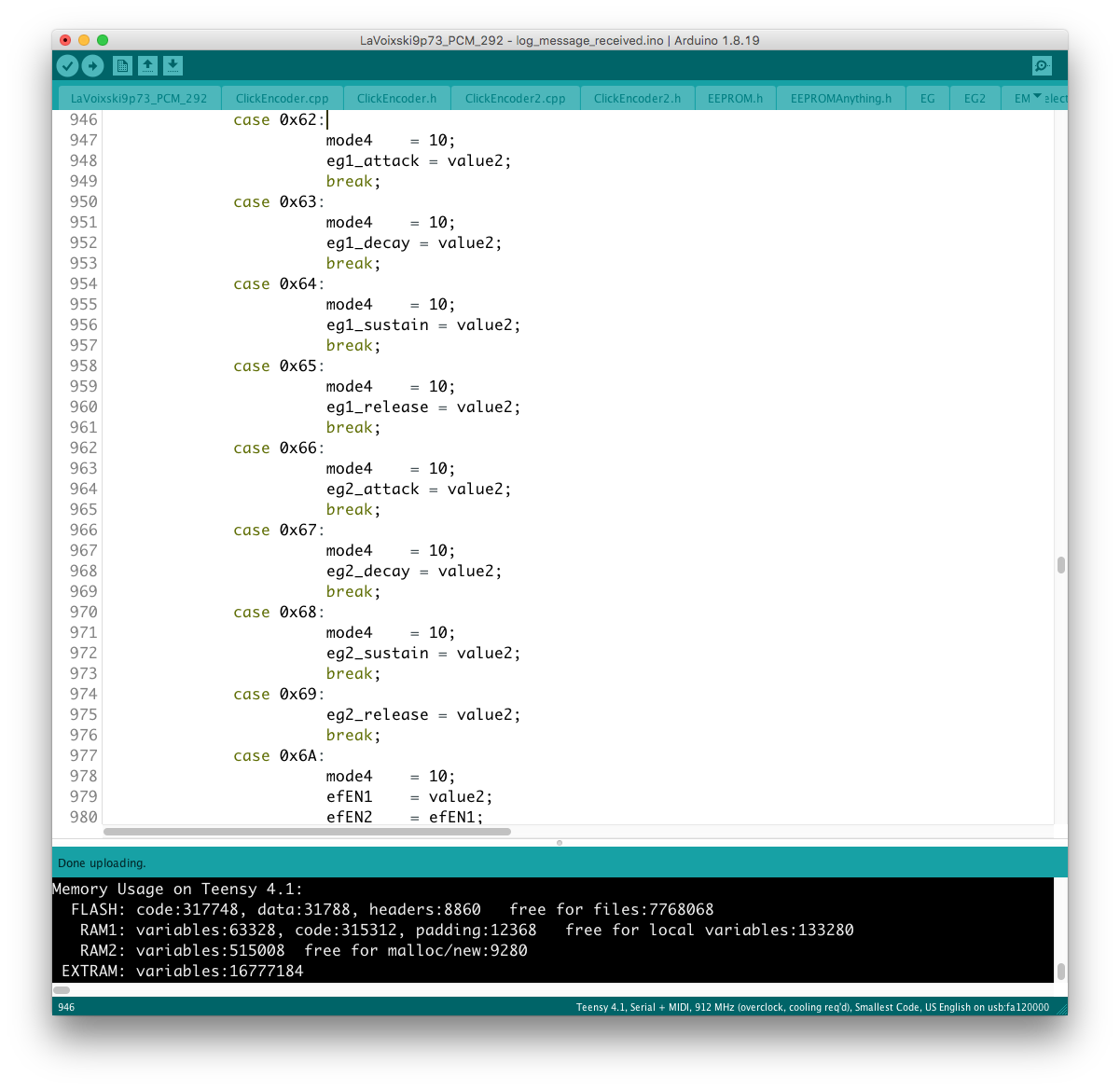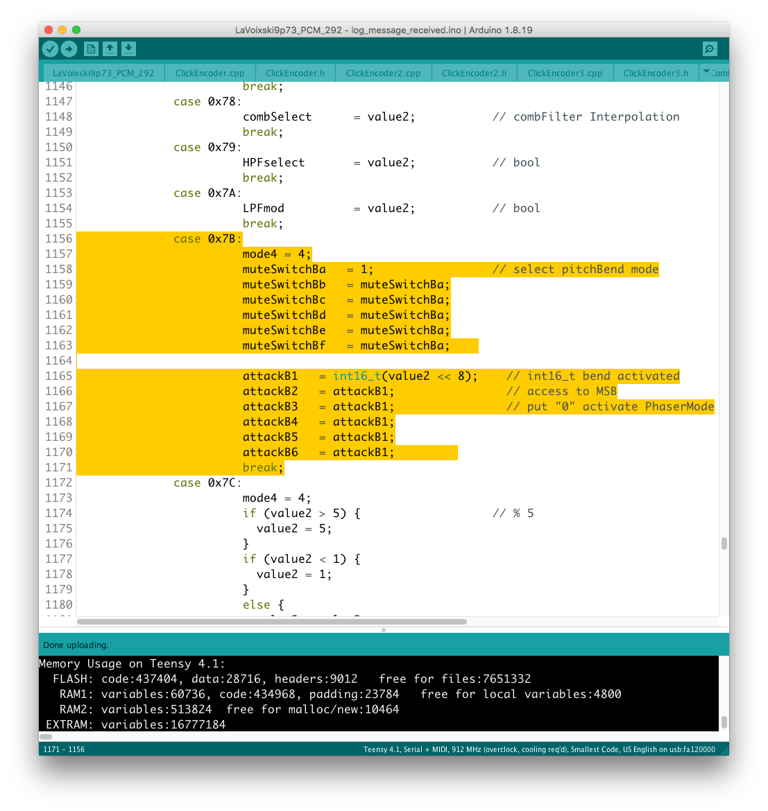 リモコン側のコードに対象となるパラメータを書き加える過程で、楽器本体側に VoiceMode 毎に分散したパラメータを一括でコントロールするグローバルコントローラを設置出来ると考えていたが、そもそもが VoiceMode 個別にシーンメモリを実装し、それを頻繁にコールしている手前、