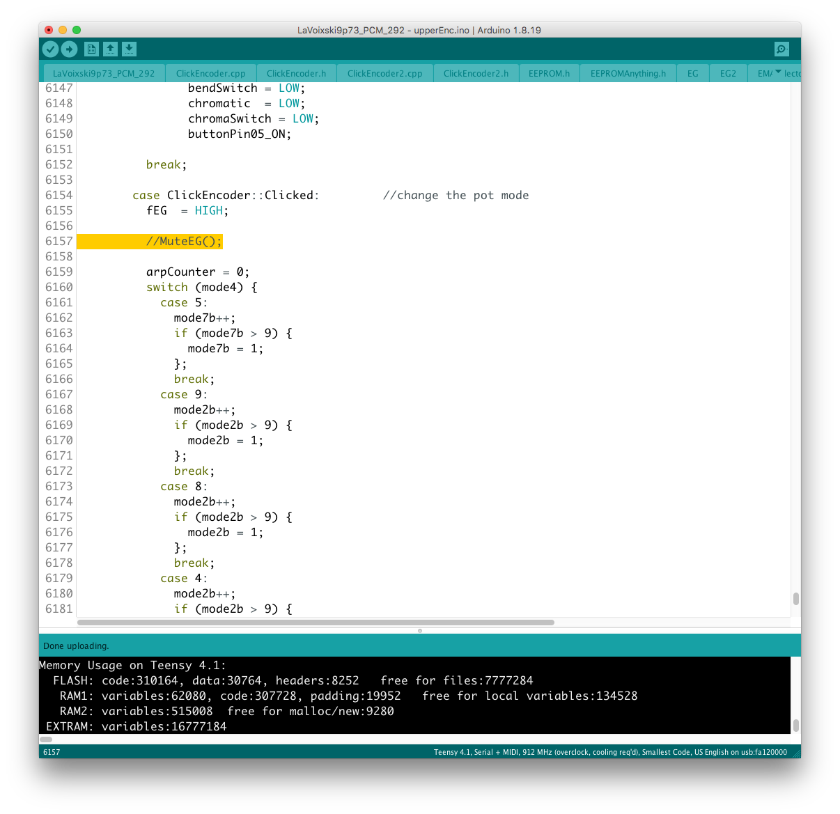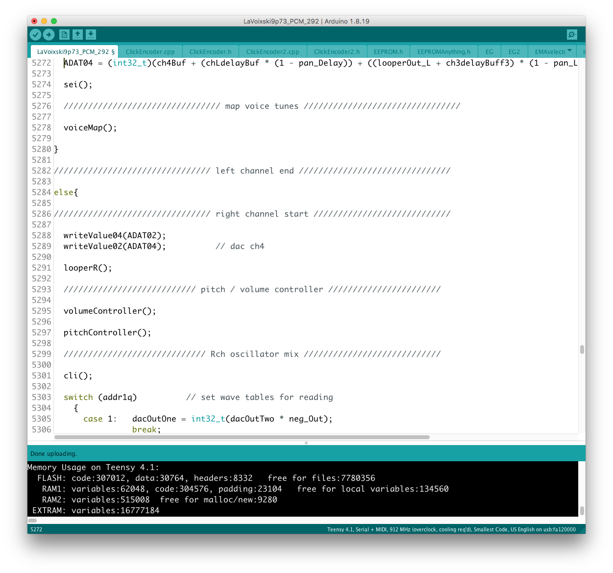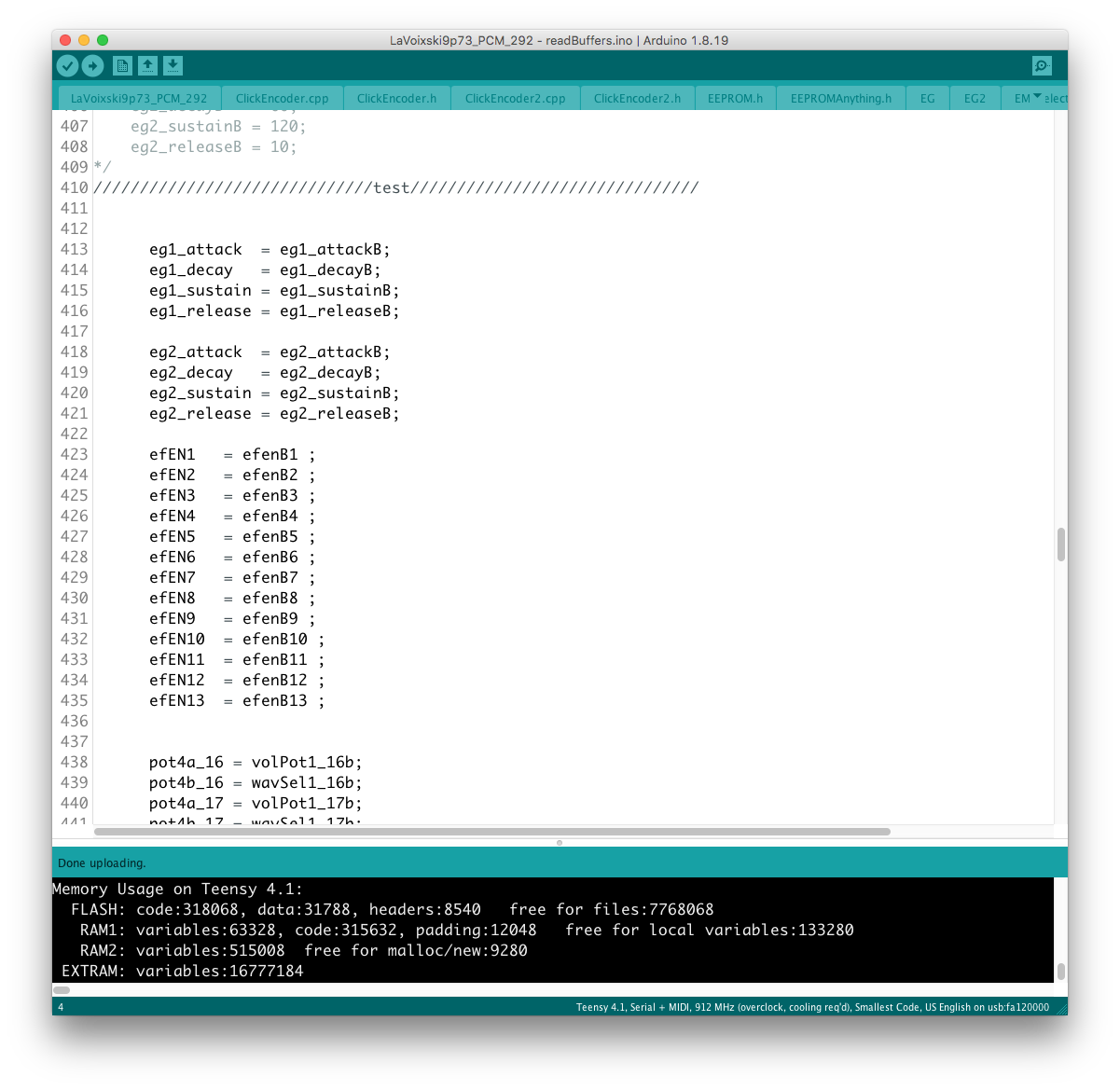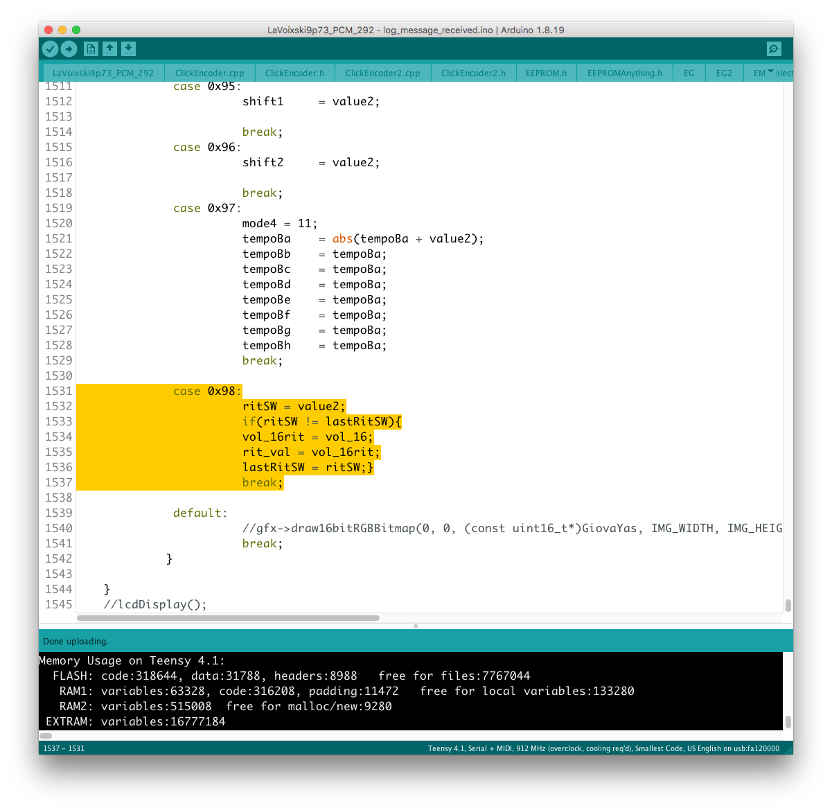 リモコン側のコードに対象となるパラメータを書き加える過程で、楽器本体側に VoiceMode 毎に分散したパラメータを一括でコントロールするグローバルコントローラを設置出来ると考えていたが、そもそもが VoiceMode 個別にシーンメモリを実装し、それを頻繁にコールしている手前、