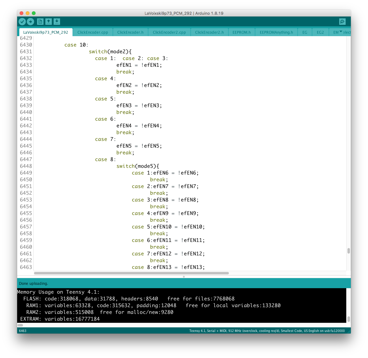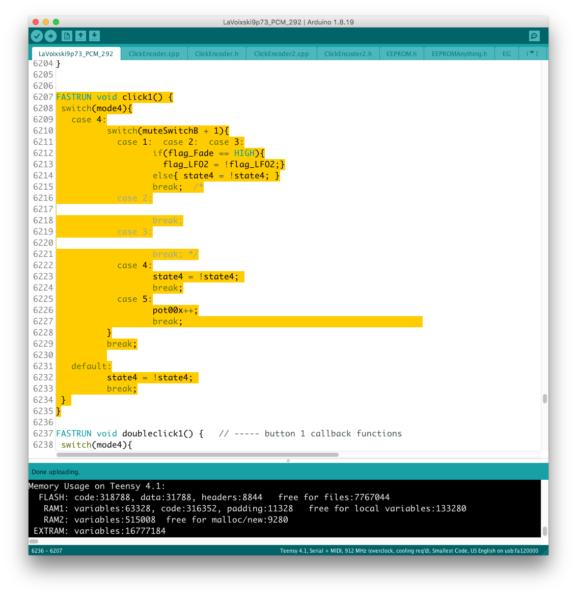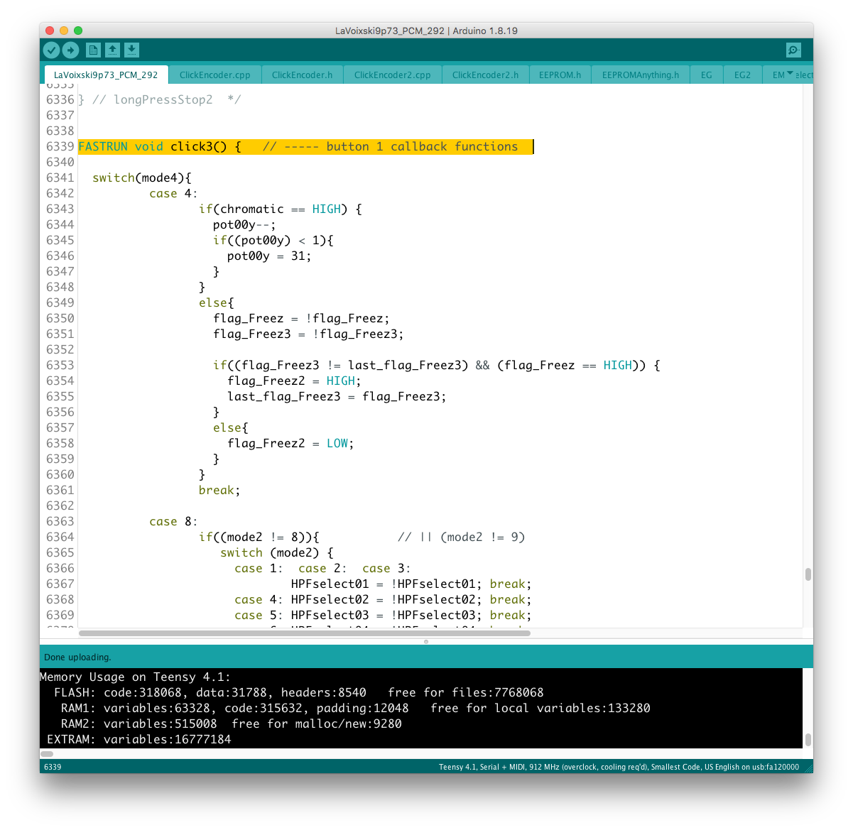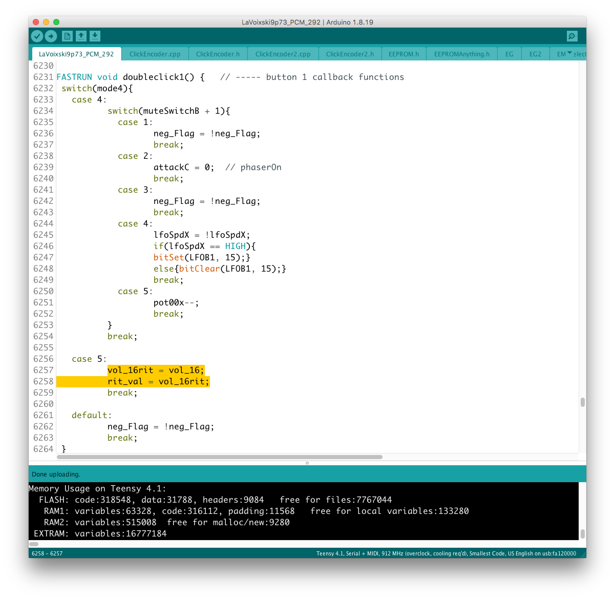 リモコン側のコードに対象となるパラメータを書き加える過程で、楽器本体側に VoiceMode 毎に分散したパラメータを一括でコントロールするグローバルコントローラを設置出来ると考えていたが、そもそもが VoiceMode 個別にシーンメモリを実装し、それを頻繁にコールしている手前、