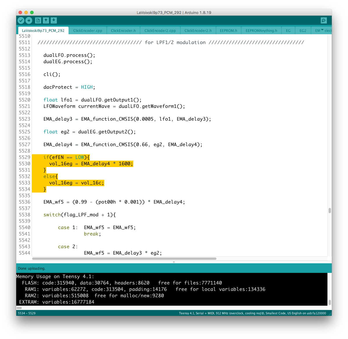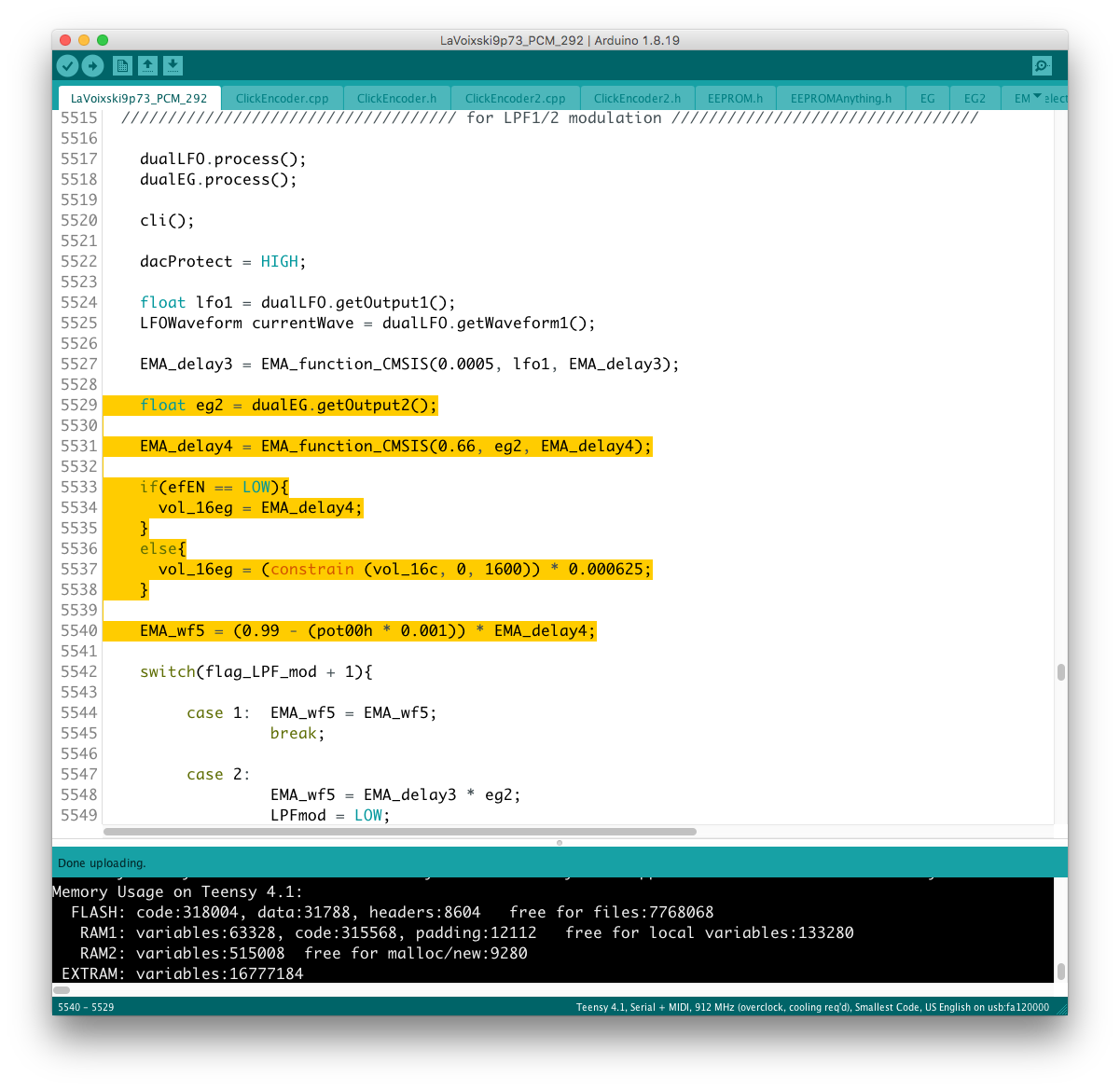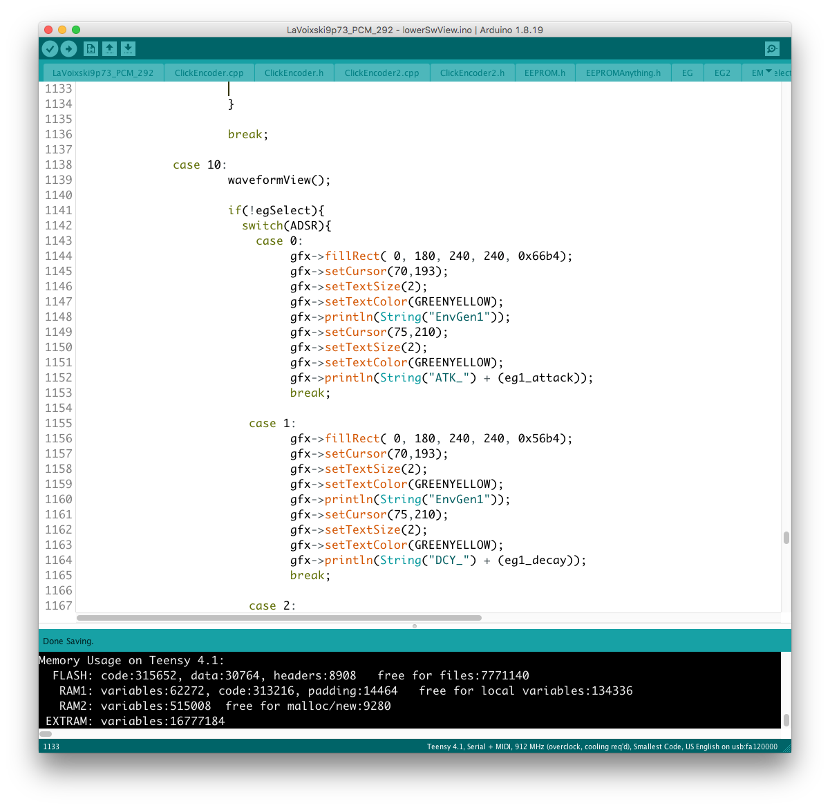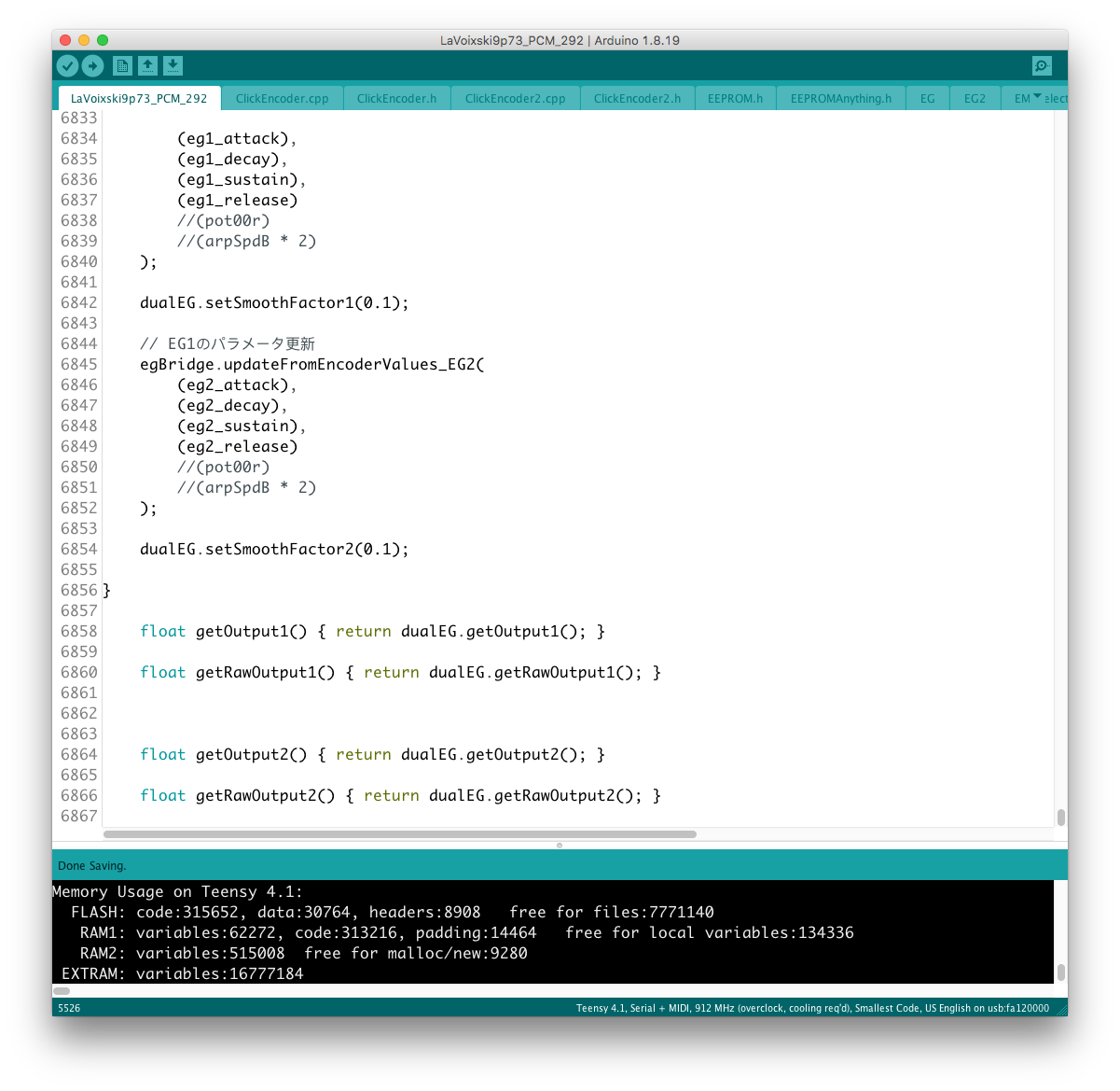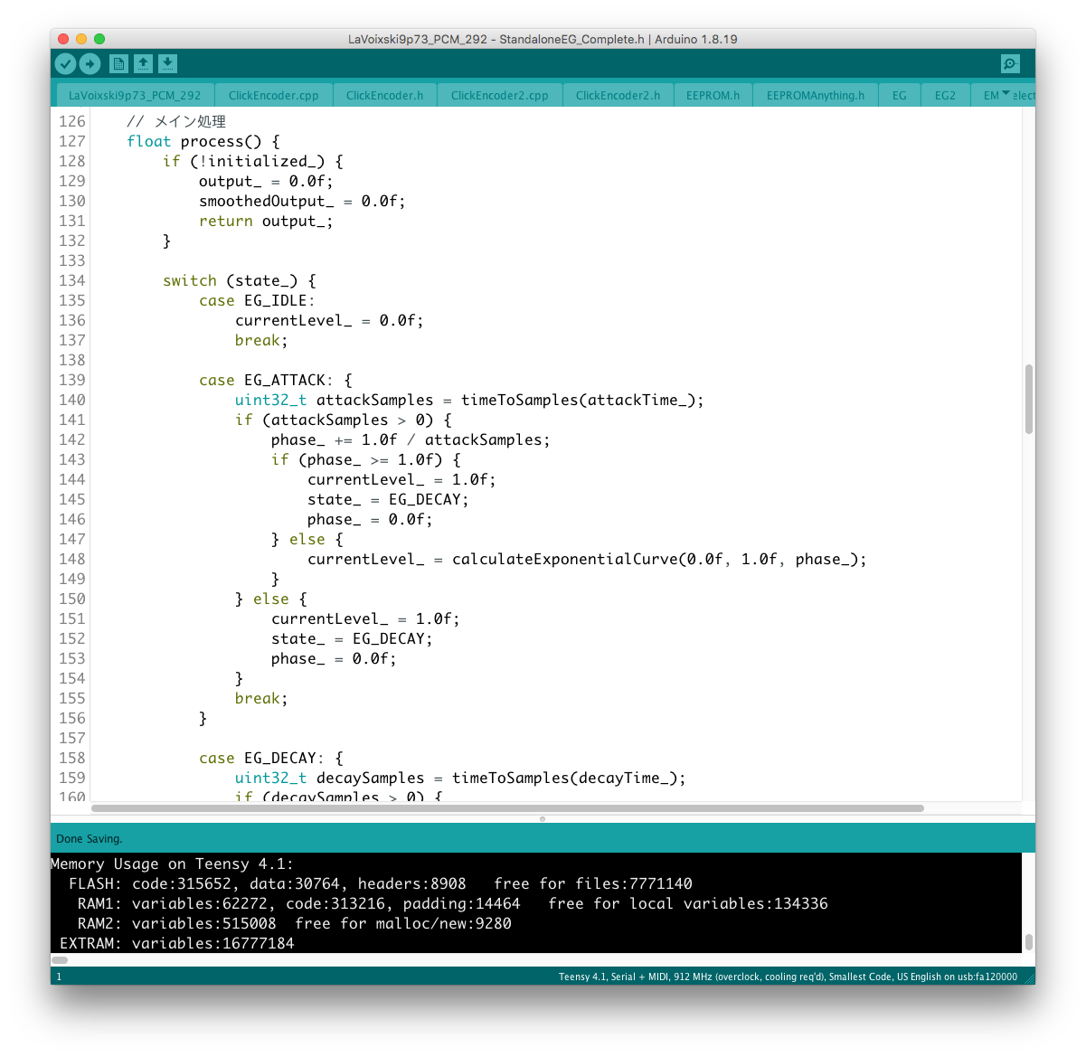 Envelope 出力は uint16_t なので、EG (float) との乗り換えを行う場合にデータ型を一致させなければならない。 現状はフィルター周りの制御を uint16_t で行っているので、実験段階では EG 出力の float 型を uint 型に近い形に整形していたが、