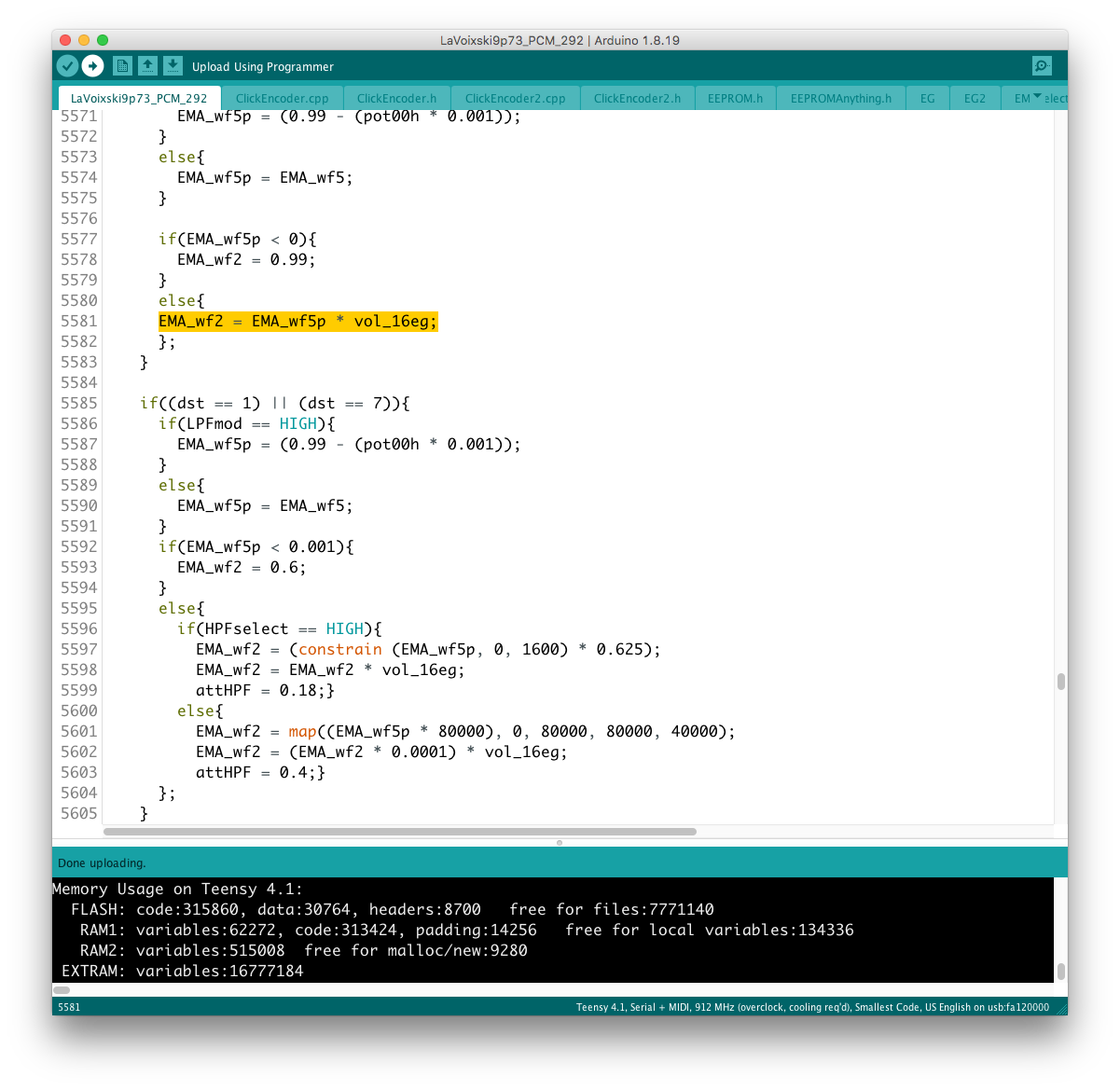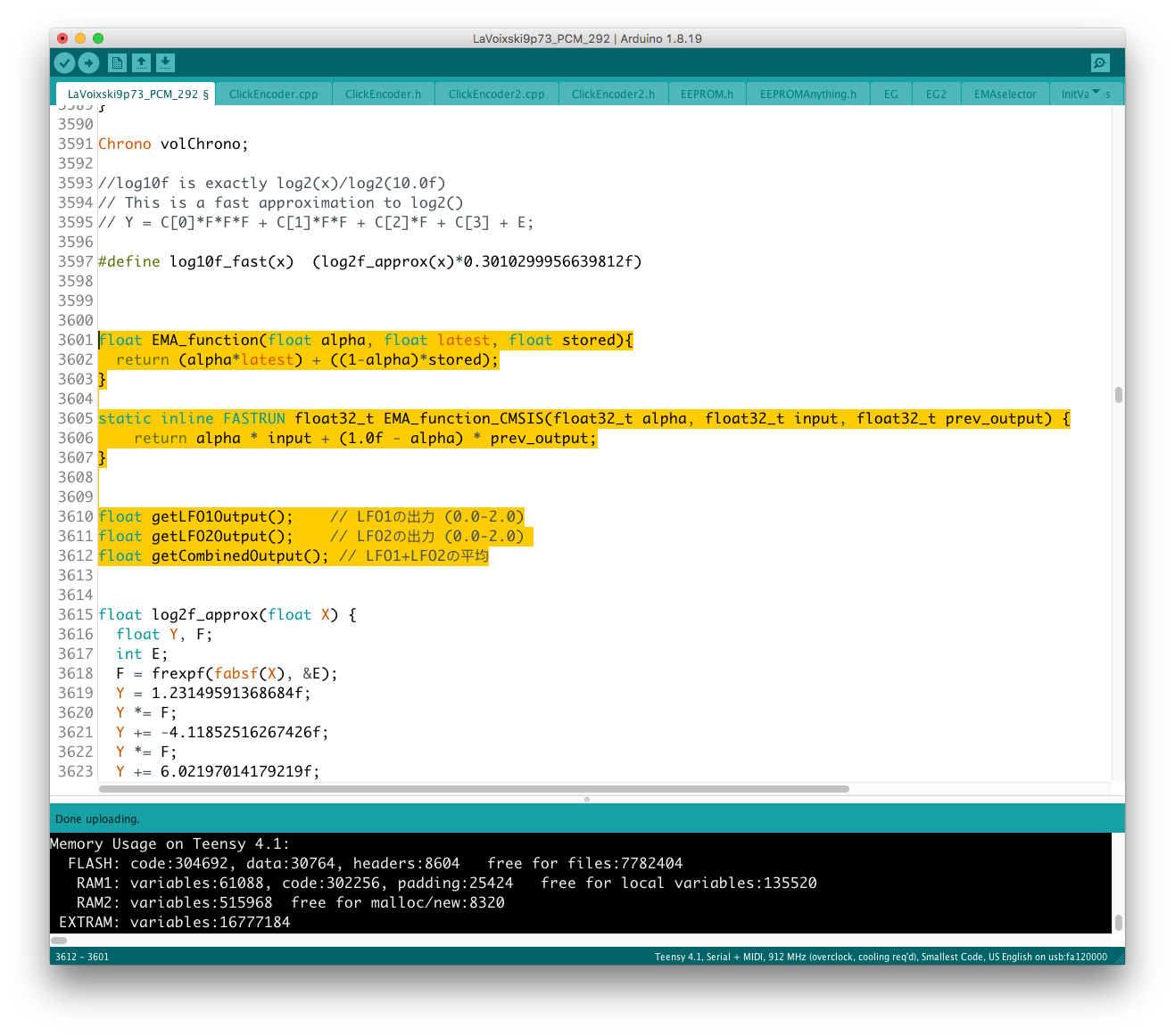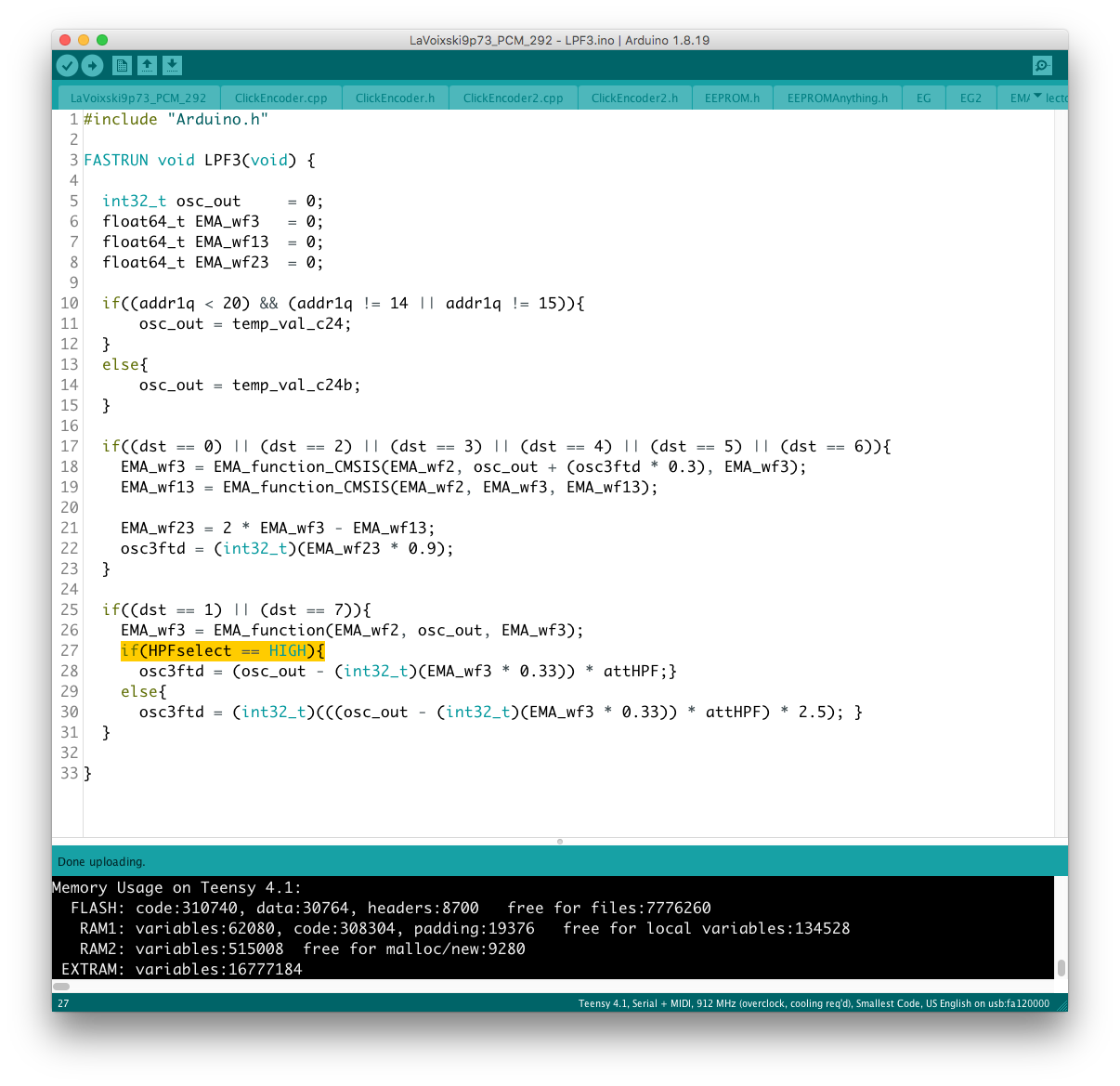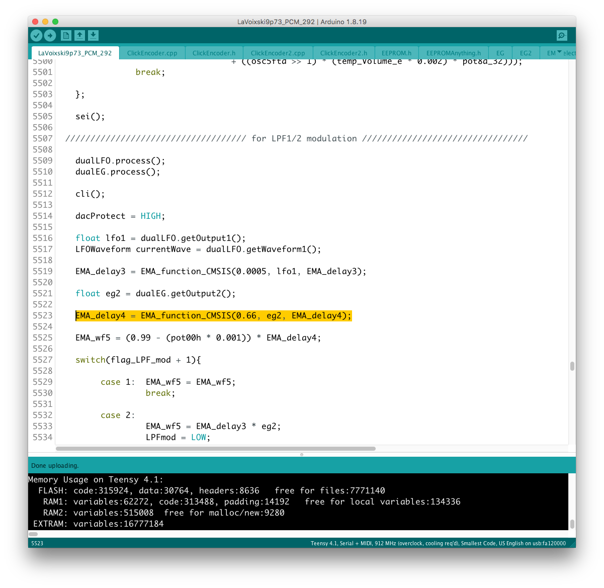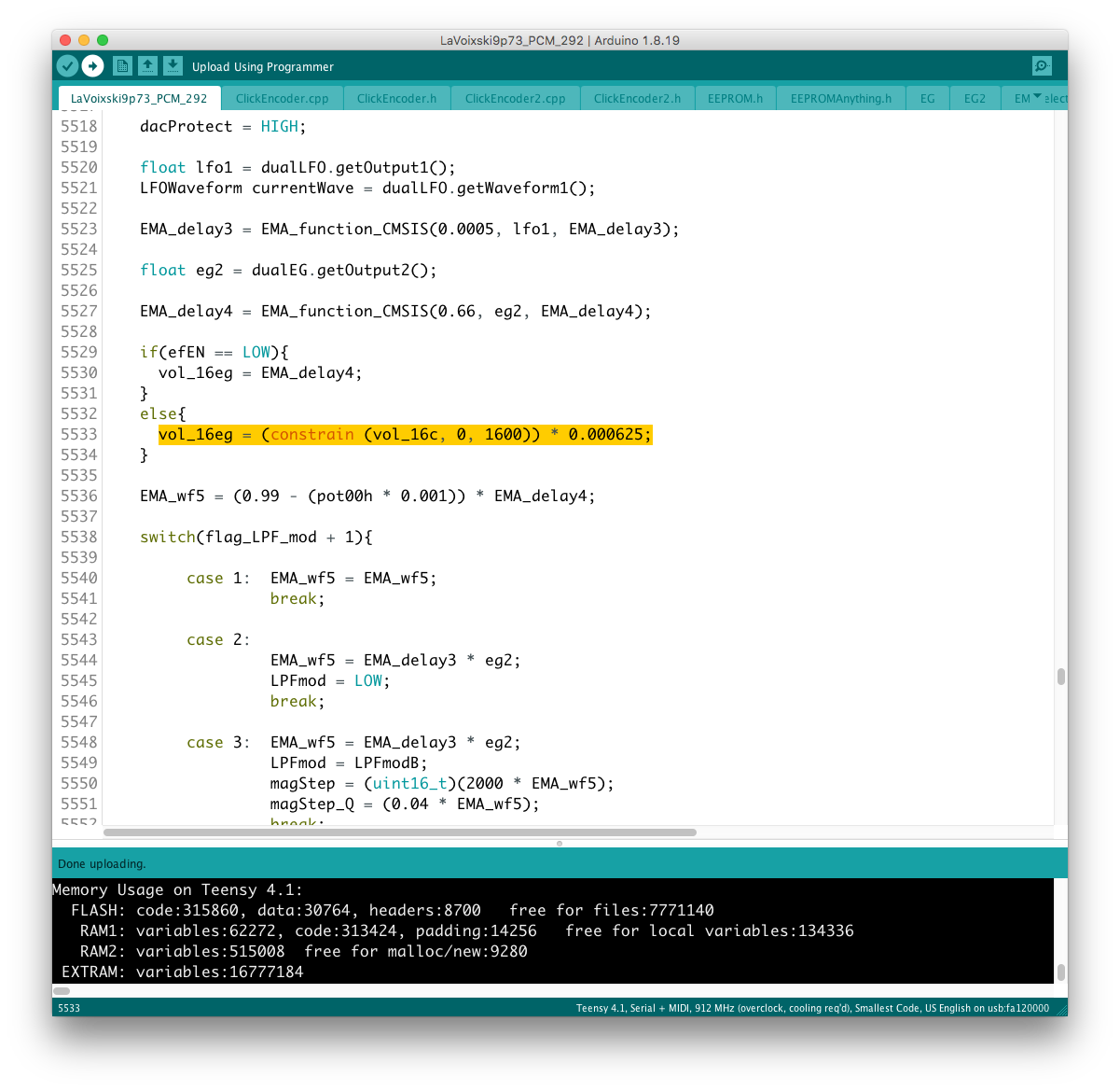 Envelope 出力は uint16_t なので、EG (float) との乗り換えを行う場合にデータ型を一致させなければならない。 現状はフィルター周りの制御を uint16_t で行っているので、実験段階では EG 出力の float 型を uint 型に近い形に整形していたが、